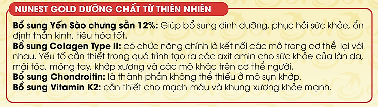 Bồi bổ sức khoẻ, đẩy lùi lão hoá Yến sào thiên nhiên (12%) (TB thị trường 5-7%): Giúp bổ sung dinh dưỡng, phục hồi sức khỏe, ổn định thần kinh, tiêu hóa tốt Collagen Type II: Giúp kiến tạo và nuôi dưỡng sụn khớp, trẻ hóa da, chống lão hóa Chondroitin (Chiết xuất Sụn Vi): Là thành phần không thể thiếu của mô sụn khớp, giúp giảm các triệu chứng đau và nguy cơ viêm khớp Vitamin K2 : Đưa Canxi gắn thẳng vào xương, giảm nguy cơ loãng xương và nguy cơ mắc các bệnh tim mạch. Cải thiện sức khỏe răng miệng.