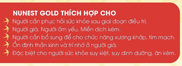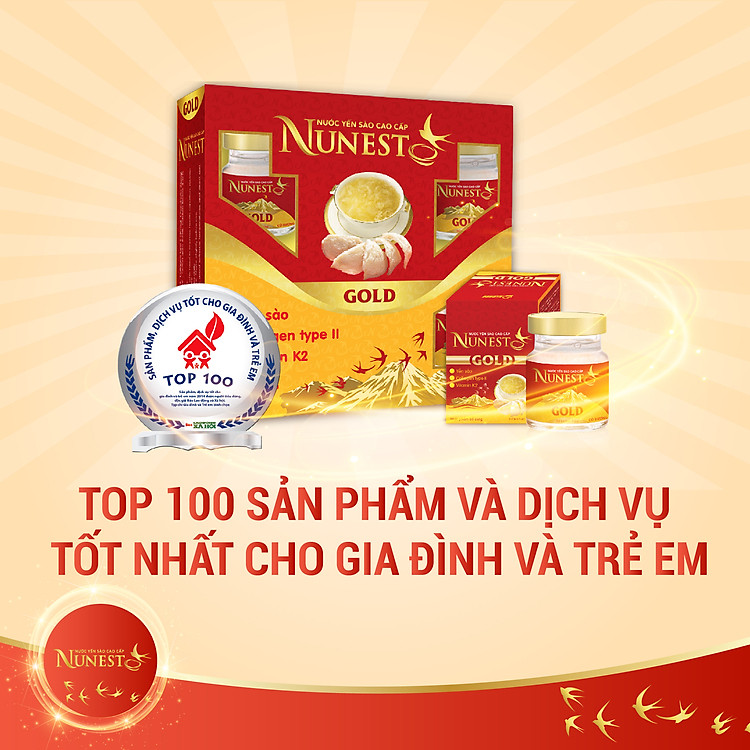 Hướng dẫn sử dụng | Bồi bổ sức khoẻ, đẩy lùi lão hoá Yến sào thiên nhiên (12%) (TB thị trường 5-7%): Giúp bổ sung dinh dưỡng, phục hồi sức khỏe, ổn định thần kinh, tiêu hóa tốt Collagen Type II: Giúp kiến tạo và nuôi dưỡng sụn khớp, trẻ hóa da, chống lão hóa Chondroitin (Chiết xuất Sụn Vi): Là thành phần không thể thiếu của mô sụn khớp, giúp giảm các triệu chứng đau và nguy cơ viêm khớp Vitamin K2 : Đưa Canxi gắn thẳng vào xương, giảm nguy cơ loãng xương và nguy cơ mắc các bệnh tim mạch. Cải thiện sức khỏe răng miệng.Từ ngàn xưa Yến Sào đã luôn là một trongđược bậc vua chúa vương công quý tộc tin dùng để bồi bổ sức khoẻ, trẻ hoá da, chống lão hoá, và nhiều công dụng khác.Yến sào Nunest là một sản phẩm cao cấp kết tinh Đông-Tây của công ty GMN,Các sản phẩm NUNEST được sản xuất bởi nguồn nguyên liệu thượng hạng, qua các khâu chọn lọc cẩn thận và kỹ lưỡng từ các chuyên gia dinh dưỡng của NUTRICARE. Trong đó, nguyên liệu chính là Tổ Yến tự nhiên, được khai thác từ Khánh Hòa. Và các nguyên liệu bổ sung (Wellmune, Collagen, Sâm tươi) được nhập khẩu từMỹ, châu Âu và Hàn QuốKhông chỉ nguồn nguyên liệu được chuẩn bị kỹ lưỡng, các sản phẩm NUNEST còn được sản xuất trên dây chuyền tự động, tiên tiến, hiện đạiVới công thức dinh dưỡng tối ưu và quy trình sản xuất nghiêm ngặt cho ra những sản phẩm tốt nhất dành cho bạn.Dành cho người từ6tuổi trở lên, cần phục hồi và tăng cường sức khỏe.(2) Công dụng chính:Bổ sung dinh dưỡng cho người suy nhược, kém ăn, miễn dịch kémTăng cường sức khỏe, ổn định thần kinh, tăng cường trí nhớ cho người cao tuổiTăng cường chức năng hệ xương, giảm nguy cơ và các triệu chứng đau do viêm khớp, bệnh tim mạch.Trẻ hóa da, chống lão hóa Hướng dẫn sử dụng:Dành cho người từ6tuổi trở lênNgày dùng 1 – 3 lọ.Có thể uống trực tiếp hoặc hòa cùng nước hoa quảLắc nhẹ trước khi sử dụng. Ngon hơn khi uống lạnh.Bảo quản:Bảo quản nơi khô ráo sạch sẽ, thoáng mát, tránh ánh nắng trực tiếp.Hạnsử dụng: 2 năm kể từ ngày sản xuấtNhà sản xuất uy tín: |