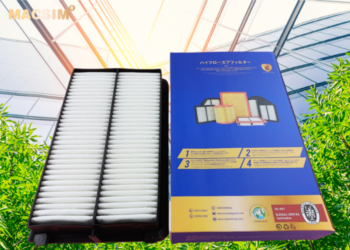 Lọc gió động cơ Macsim sản xuất từ loại giấy chuyên dụng không dệt (thổi tan chảy). Lớp màng lọc với những sợi lông tích điện nhiều lớp kháng nước.