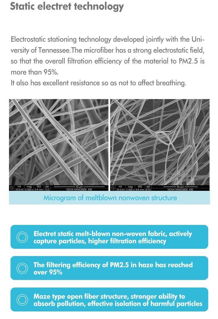 | Cấu tạo chất liệu gồm 4 lớp | Lớp 1: Lớp màng lưới sợi nhỏ tích điện ngăn khói, bụi kích thước hạt lớn. Lớp 2: Vải thổi tan chảy không dệt, kháng nước, kháng độ ẩm, ngăn bụi mịn, siêu mịn và khói. Lớp 3: Than hoạt tính làm từ vỏ dừa Sri Lanka hấp thụ khói khử mùi. Lớp 4: Nano bạc chống virut vi khuẩn |