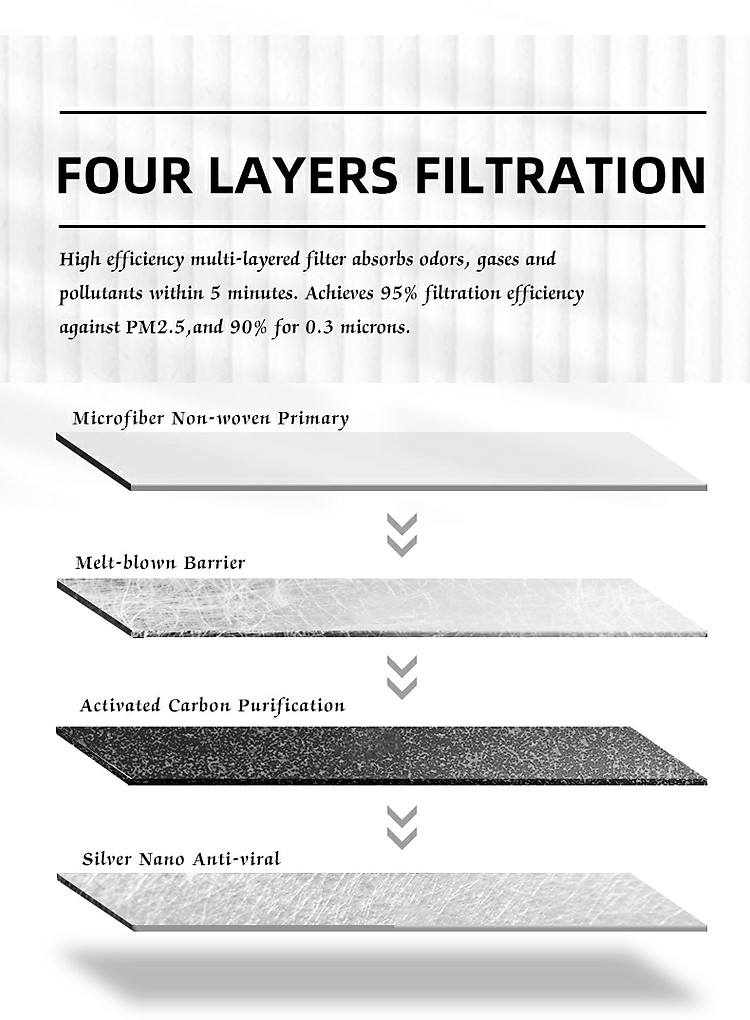 | Cấu tạo chất liệu gồm 4 lớp | Lớp 1: Lớp màng lưới sợi nhỏ tích điện ngăn khói, bụi kích thước hạt lớn. Lớp 2: Vải thổi tan chảy không dệt, kháng nước, kháng độ ẩm. Lớp 3: Than hoạt tính. Lớp 4: Chống virut vi khuẩn |