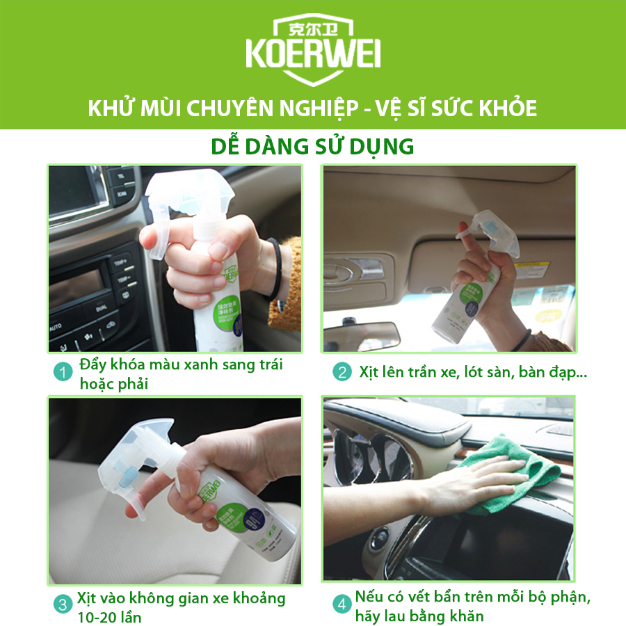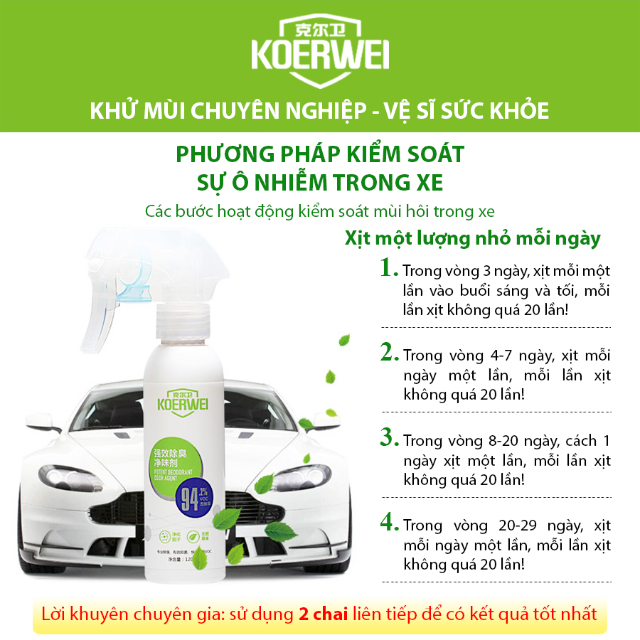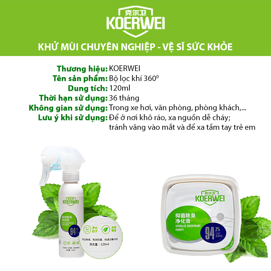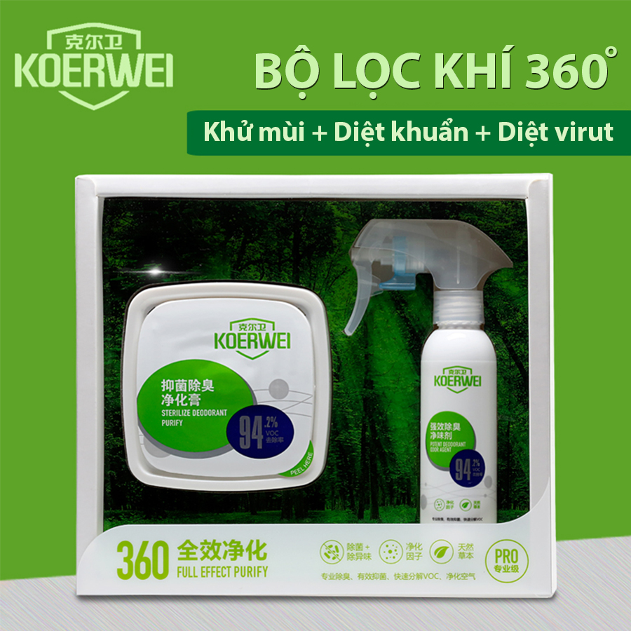 Bộ lọc khí 360 độ KOERWEI là bộ 2 sản phẩm chiết xuất từ chất men thực vật của cây cỏ, không độc hại, thông qua giải pháp phun sương phân giải, thấm sâu, khử mùi mạnh, nhanh chống tiêu hủỵ các mùi lạ thoát ra từ máy lạnh, mùi thuốc lá, mùi tanh hoặc các mùi gây ra bởi chất hoá học, đặc biệt khử mùi và diệt khuẩn hiệu quả đối với các mùi hôi cực khó chịu.