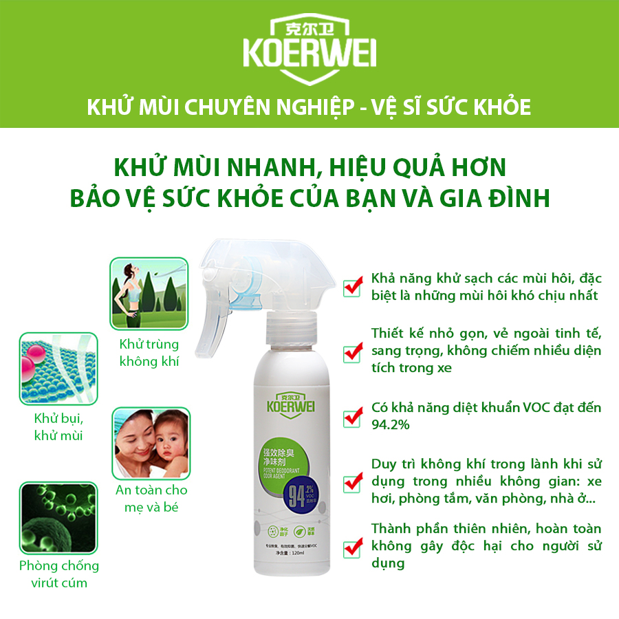 - Bộ lọc khí 360 độ KOERWEI đến từ thương hiệu uy tín hàng đầu sở hữu thiết kế nhỏ gọn, tinh tế, có khả năng khử mùi không khí đáng kinh ngạc. Thành phần phân tử tự do (OH-), thông qua kích hoạt chất xúc tác nano sẽ có tác dụng tự động phân giải các khí có hại,có khả năng diệt khuẩn VOC đạt tới 94.2%, phân giải các chất gây ô nhiễm môi trường như nitrogen dioxide và sulfide, còn có thể phá huỷ các màng tế bào vi khuẩn, vì thế có khả năng diệt khuẩn cực mạnh, khử mùi, chống nấm mốc.