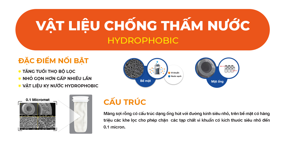 + Khả năng loại bỏ tạp chất, vi khuẩn kích thước nhỏ hơn 0.1 µm (micromet)