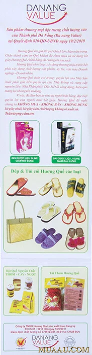 Mặt trong (màu trắng) có biểu tượng DANANG VALUE (Sản phẩm thương mại đặc trưng chất lượng cao của thành phố Đà Nẵng). Có thêm nội dung và các sản phẩm của công ty đang sản xuất và kinh doanh.