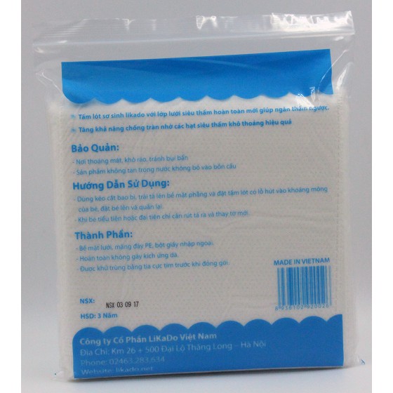 Tấm lót phân xu cho bé sơ sinh LIKADO ******************************************** Thông tin sản phẩm Bịch 30 tờ Kich thước tấm lót 20*20cm Thương hiệu : LIKADO VIETNAM ******************************************** + Trẻ sơ sinh có một làn da mỏng manh và nhạy cảm hơn so làn da của những người trưởng thành.Chính bởi làn da như vậy nên trẻ sơ sinh có thể dễ dàng bị tổn thương do các yếu tố từ bên ngoài tác động đến. Các sản phẩm được tiếp xúc trực tiếp với làn da của trẻ nhỏ mà không đảm bảo chất lượng và an toàn thì sẽ rất dễ làm làn da của trẻ nhỏ bị mẩn ngứa hay trẻ sẽ bị dị ứng. + Chính vì thế nên khi lựa chọn bất kì một sản phẩm nào đó sử dụng cho trẻ sơ sinh, các mẹ cần phải quan tâm đến chất lượng của sản phẩm cũng như nguồn gốc xuất xứ của chúng. Điều này cần phải được chú trọng để không làm ảnh hưởng tới sức khỏe của trẻ. Với những miếng lót dành cho trẻ sơ sinh cũng như vậy, vấn đề chất lượng cũng phải được đặt lên hàng đầu. + Những miếng lót ấy phải có một bề mặt tiếp xúc với trẻ nhỏ phải mềm mại và tạo cảm giác thoải mái cho trẻ khi sử dụng. Hơn thế nữa, những miếng lót sơ sinh ấy cũng phải đảm bảo được độ thấm hút. Làn da của trẻ nhỏ sẽ được khô thoáng khi lựa chọn những sản phẩm có độ thông thoáng. Và miếng lót sơ sinh khi được lựa chọn cũng cần phải quan tâm đến vấn đề này các mẹ nhé. Làn da của trẻ nhỏ được thoáng mát sẽ có thể hạn chế được tình trạng trẻ bị hăm da. ******************************************** LƯU Ý KHI SỬ DỤNG + Không sử dụng miếng lót sơ sinh cho trẻ trong suốt 24 giờ + Làn da mỏng manh của trẻ nhỏ cũng cần đến độ thoáng mát. + Chính vì vậy việc sử dụng miếng lót sơ sinh dành cho trẻ nên có khoảng thời gian phù hợp. Nếu như các bậc phụ huynh sử dụng miếng lót sơ sinh cả ngày đối với trẻ sẽ rất dễ dẫn đến tình trạng làn da của trẻ nhỏ khó chịu và trẻ sẽ khó chịu vì cảm thấy vướng víu. +Sau mỗi lần thay miếng lót cũ cho trẻ nhỏ, các mẹ nên làm vệ sinh sạch sẽ vùng cơ thể đó của trẻ và để một khoảng thời gian ngắn để tạo sự thông thoáng và mát mẻ cho trẻ trước khi sử dụng miếng lót mới. Cân vệ sinh sau mỗi lần thay miếng lót sơ sinh