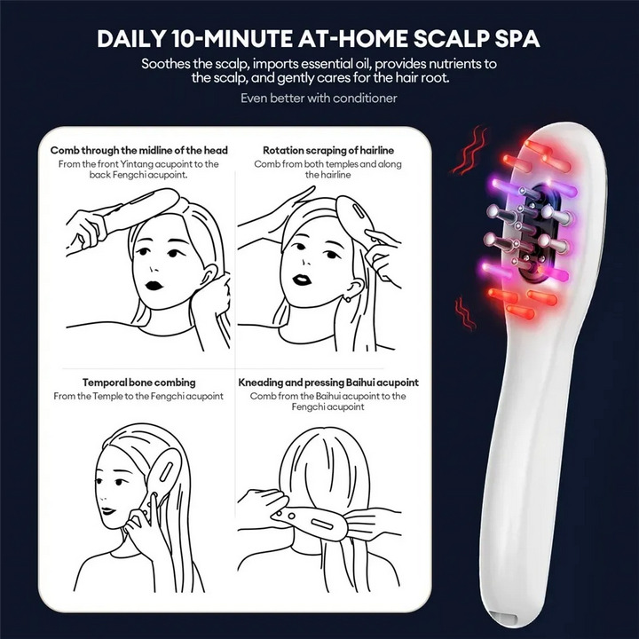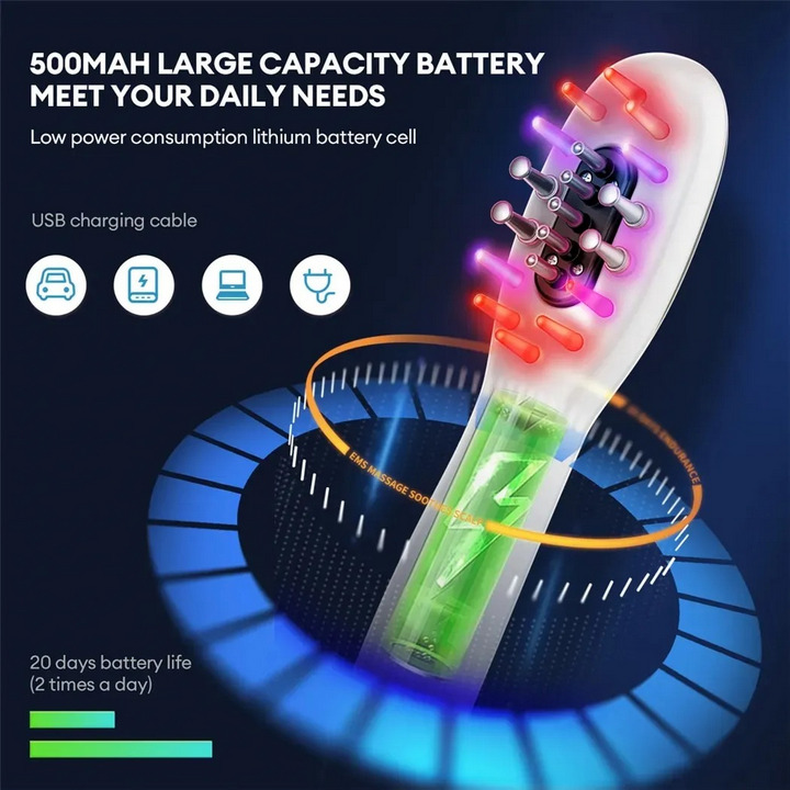 - Công nghệ vi xung EMS + Massage rung tần số cao: - Các xung điện nhẹ nhàng xuyên qua lớp biểu bì để Massage da đầu, các rung động tần số cao kích thích tuần hoàn máu, kích thích mọc tóc, thúc đẩy quá trình tái tạo tế bào.