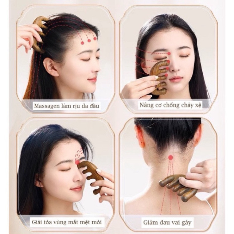 Lược được thiết kế răng thưa, đầu răng tròn khi Massage sẽ cảm thấy êm diu dễ chịu, dùng để chải tóc, mát xa da đầu lưu thông máu não, hỗ trợ các triệu chứng đau đầu. Mát xa nâng cơ mặt, Cạo gió toàn thân...