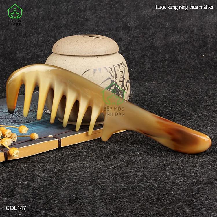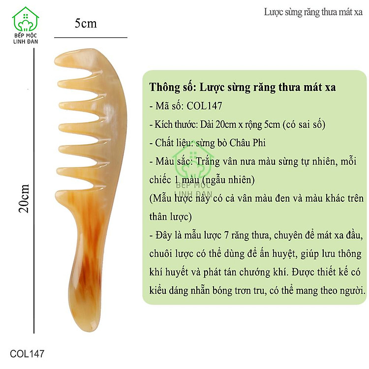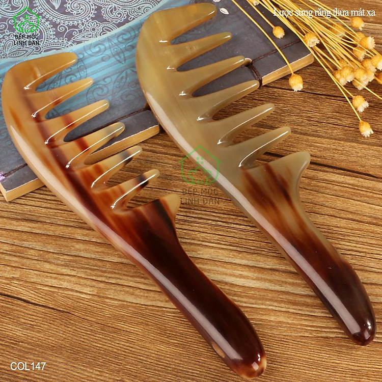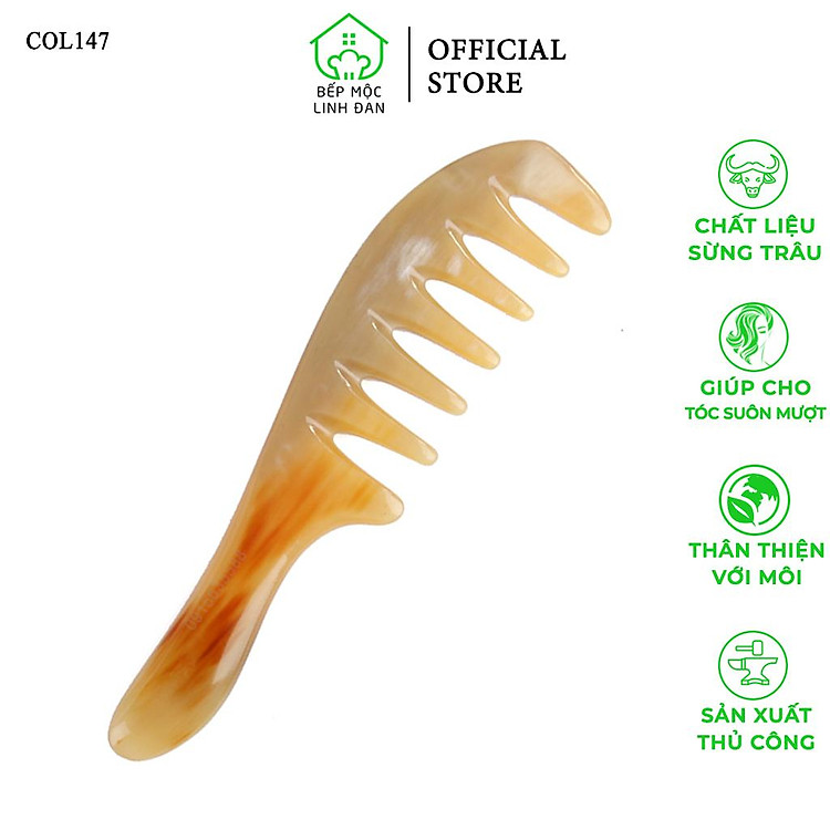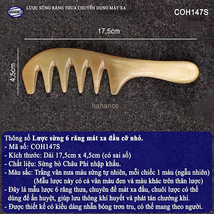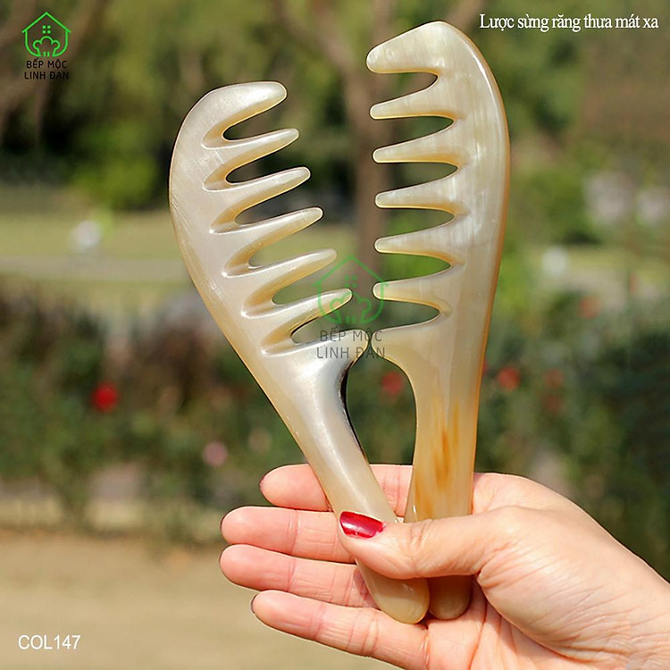 - Đây là chiếc lược sừng cao cấp đặc biệt, tay cầm thon gọn, dày và rất đẹp, răng thưa, đầu răng tròn, vừa để chải các loại tóc xoăn, xù, rối và Massage đầu giúp tuần hoàn và lưu thông máu cực tốt, thư giãn sảng khoái, chuôi lược còn có tác dụng điểm huyệt.