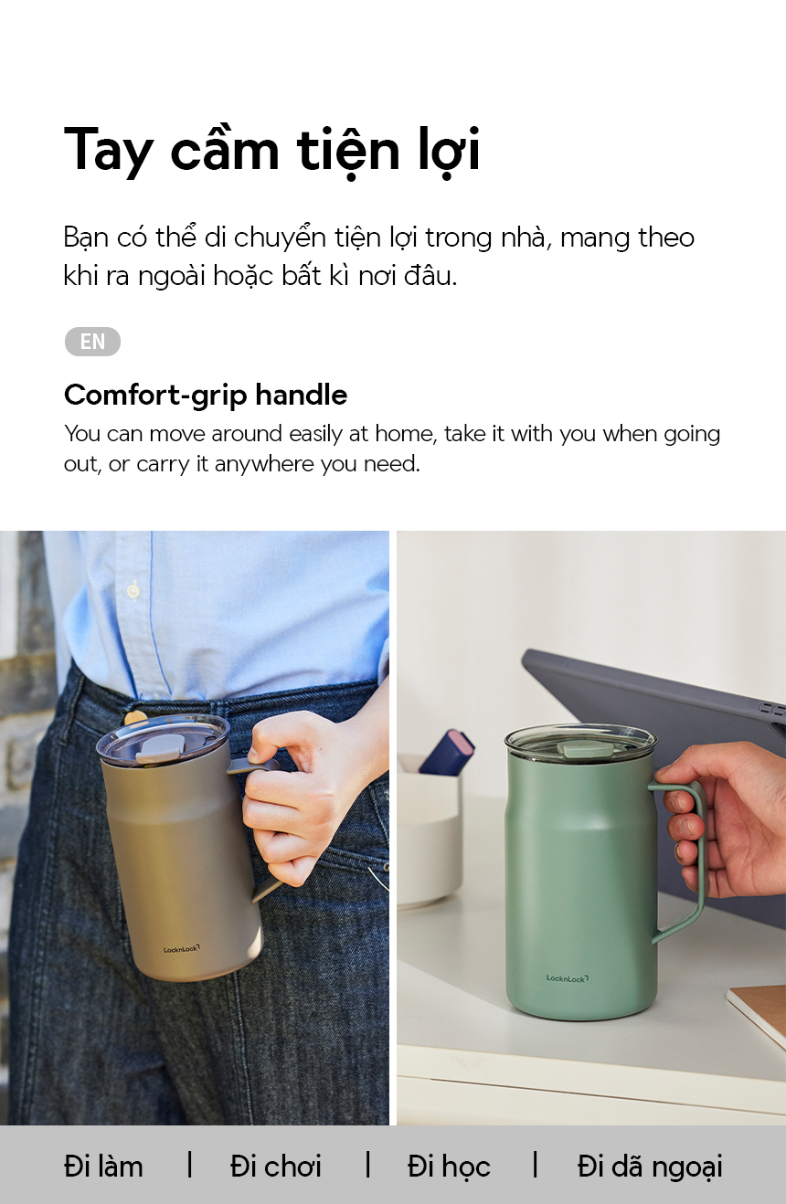 - Tay cầm tiện lợi: Tay cầm tiện lợi giúp bạn dễ dàng mang theo bình mọi nơi, đặc biệt phù hợp khi sử dụng tại văn phòng hoặc trường học