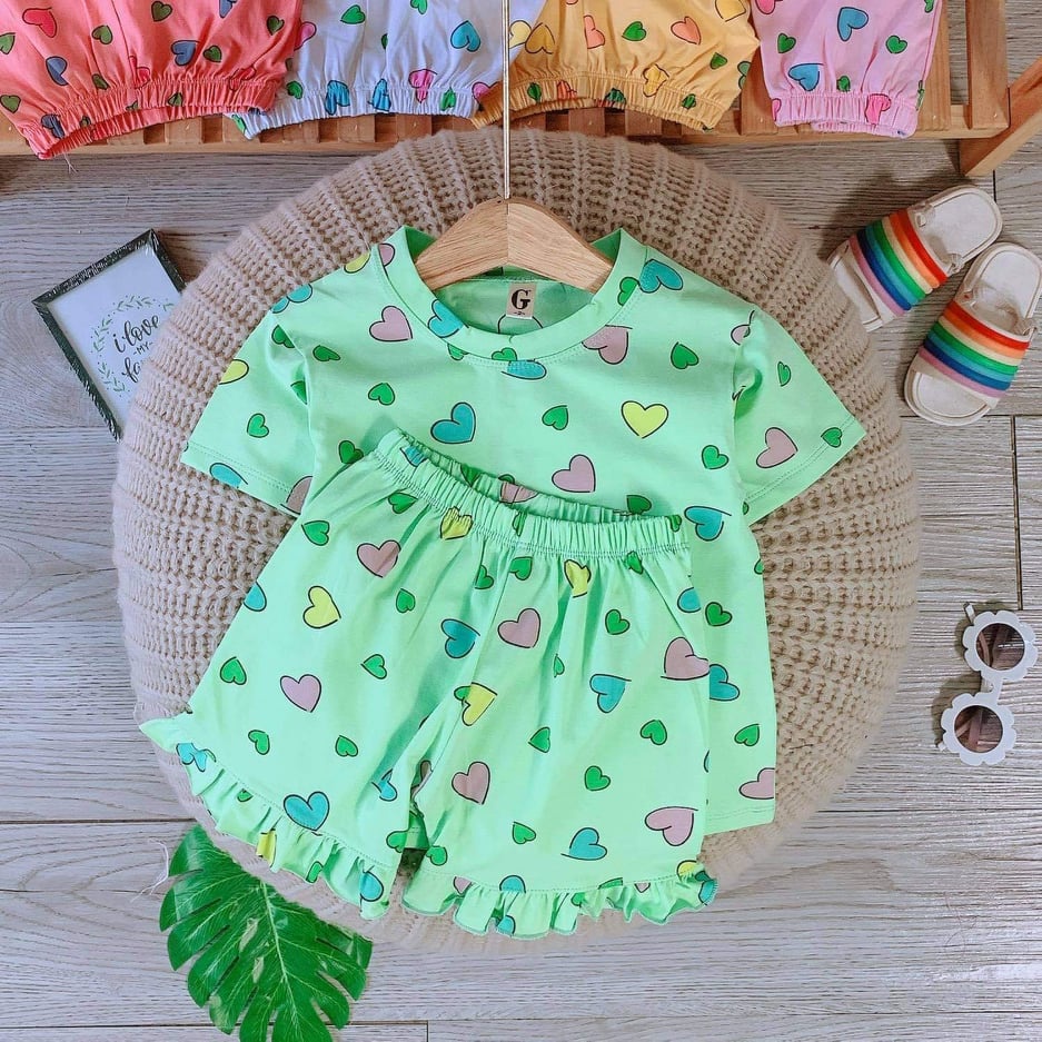 Thời trang trẻ em & trẻ sơ sinh > Quần áo bé gái > Com lê & đồ bộ || Lyvyshop - (HÀNG LOẠI 1) Bộ cộc tay trái tim form siêu dễ thương cho bé gái từ 09-28kg