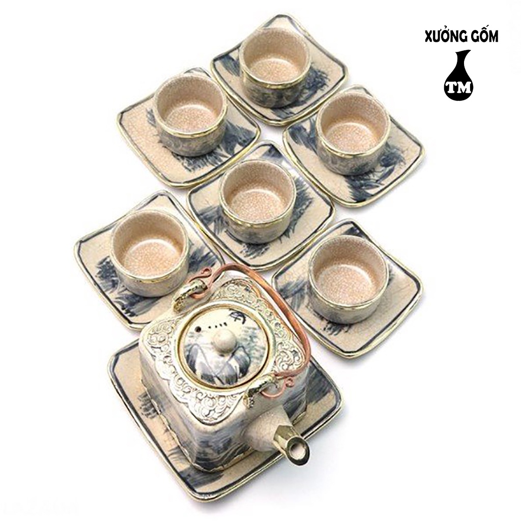 Bộ Ấm Chén Men Rạn Dáng Vuông Bọc Đồng 500ml Xưởng Gốm TM Bát Tràng( Bộ bình trà, uống trà,chén trà)