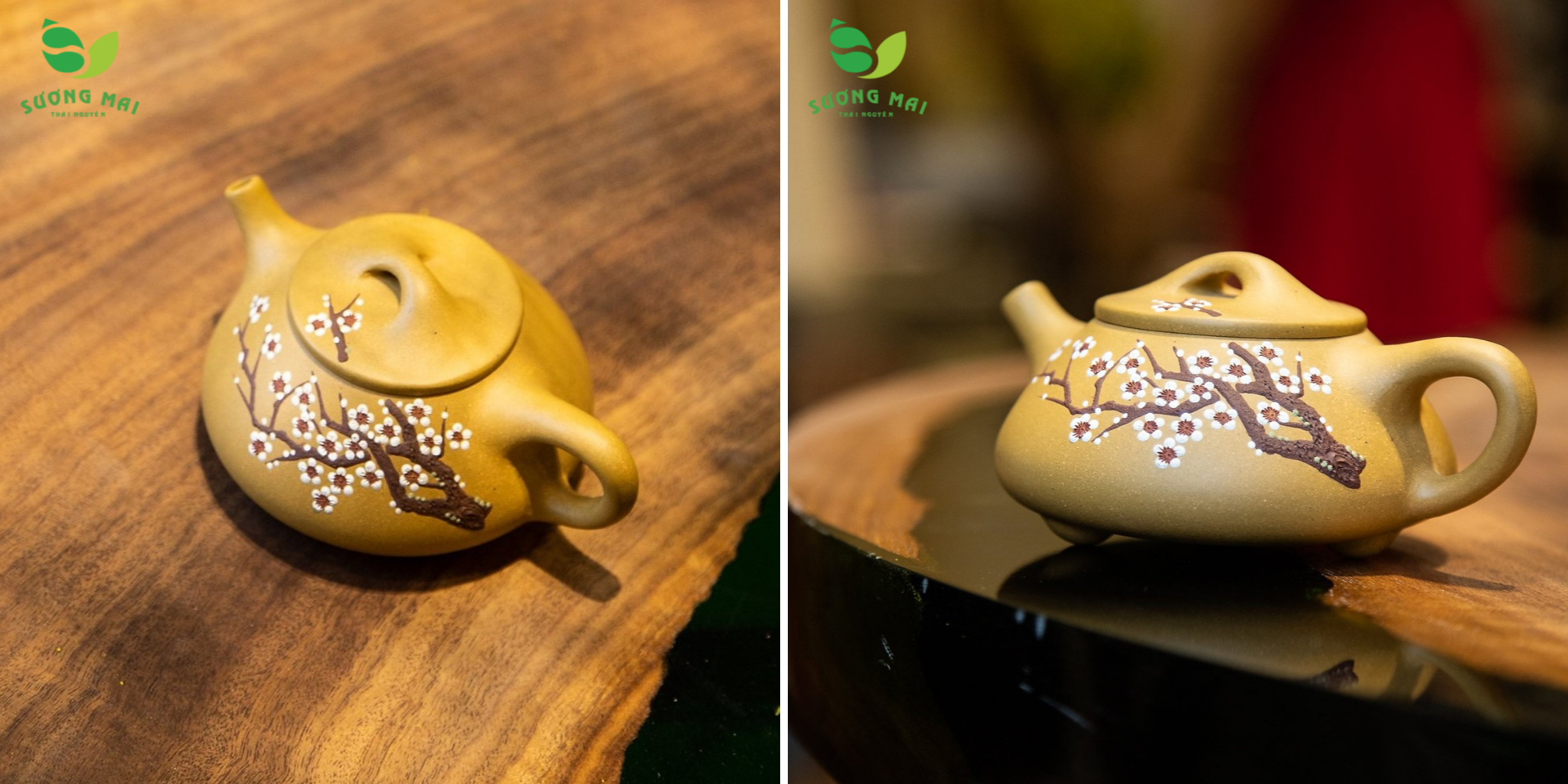 Lưu ý | Bộ Ấm Chén Thạch Biều Đoàn Nê Cổ Thụ Mai, Đoàn Nê Nguyên Khoáng, Thủ Công 220ml- Họa tiết: Hoa Mai- Chế tác: Thủ công toàn chế- Chất đất: Đoàn nê nguyên khoáng- Ấm kích thước: 13,8cm x 6,9cm, dung tích 220ml- Thoát nước: Hoa mai 9 lỗ- Chén kích thước: 6cm x 2,8cm, dung tích 50ml |