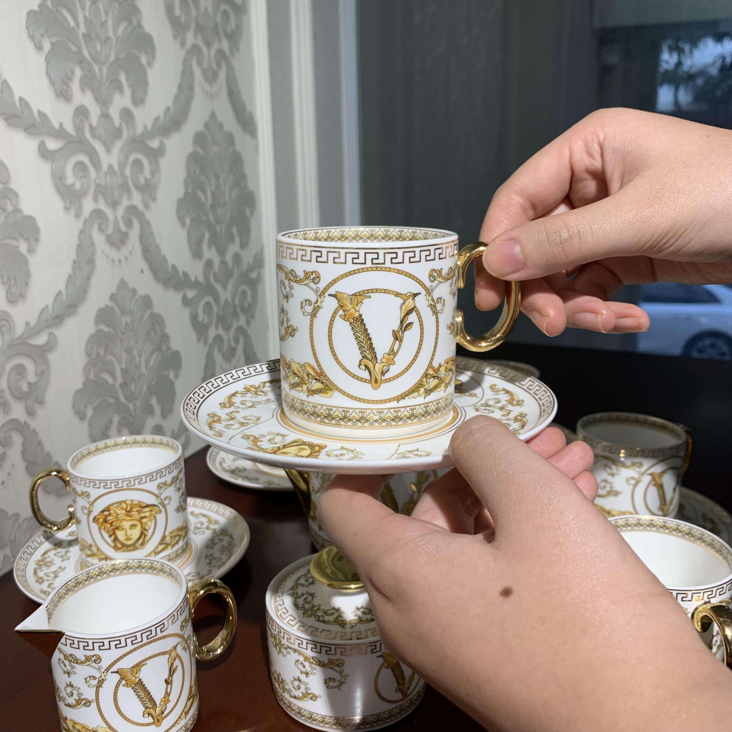 - 01 Ấm trà phong cách Châu Âu có dây hoa chạy xung quanh và biểu tượng chữ V sang trọng. Quai ấm và vòi ấm mạ vàng đẳng cấp tinh tế. (R:11cm, C:11cm)