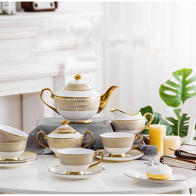 - Bộ trà gồm: * 4 Tách Trà * 4 Đĩa lót * 1 Bình trà dung tích (700ml ~ 1000ml tuỳ mẫu) * 1 Jug đựng sữa * 1 Jug Đường