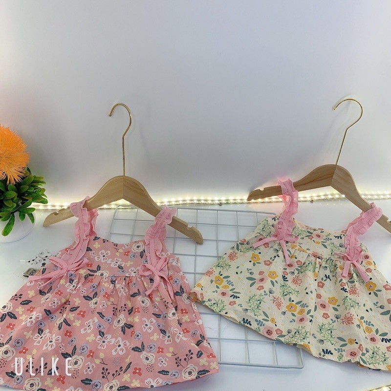 Giới thiệu Bộ thô mềm hoa nhí hai dây viền bèo , nhún phối nơ cho bé gái.