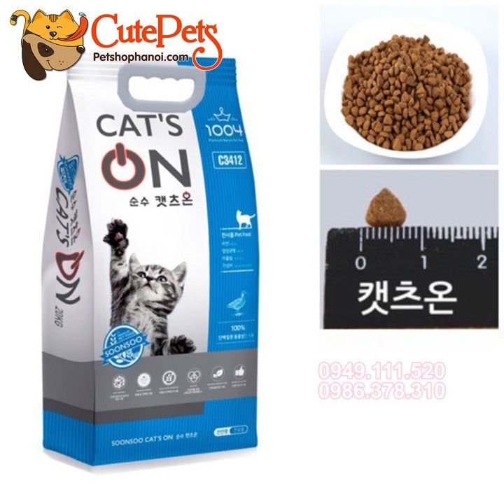 Thức ăn mèo Cats On Tải 5kg hạt cho mèo mọi lứa tuổi Hàn Quốc - CutePets - Thông tin sản phẩm: Thức ăn hạt nhập khẩu từ Hàn Quốc với thành phần chính gồm thịt vịt, thịt gà và các loại rau củ quả cùng nhiều Vitamin và khoáng chất với lượng đạm lên tới hơn 33% giúp cho mèo có bữa ăn ngon và giàu dinh dưỡng
