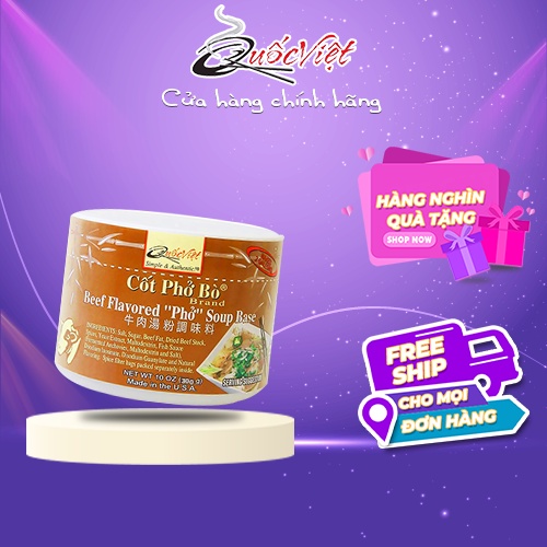 THÔNG TIN SẢN PHẨM: + Thương hiệu: Quốc Việt Foods + Xuất xứ. Mỹ + Quy cách đóng gói: Hộp 300g + Hạn sử dụng: 36 Tháng kể từ ngày Sản xuất + Nấu được 30 tô (10 lít nước dùng) + Thành phần: Muối, đường, mỡ bò, thịt bò khô, gia vị, chiết xuất nấm men, nước mắm.