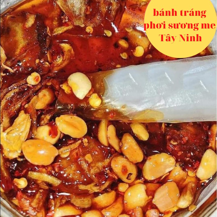 Thành phần: Bánh tráng phơi sương, nước sốt me, đậu phộng, hành phi,