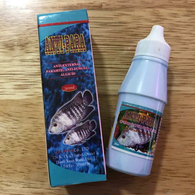 Đặc trị ký sinh trùng trên cá cảnh Anti-Para - Model: Anti-Para - Hãng sản xuất: ARC - Xuất xứ: Việt Nam - Dung tích: 30ml - Thành phần: Anti-External, Parasite, Anti-Fungal, Algicid Liều dùng: Lắc đều trước khi sử dụng. Cho thuốc trực tiếp vào bể 1 giọt/ 5 lít nước trong ngày đầu tiên, đợi 48h sau lặp lại liều và để 5-7 ngày thì thay nước. Tắm cho cá: 10-15 giọt/ lít nước, tắm trong 30 phút. Bảo quản: Đóng nắp sau khi sử dụng. Bảo quản nơi thoáng mát, tránh ánh sáng trực tiếp. Để xa tầm tay của trẻ em và vật nuôi. Đọc kỹ hướng dẫn xử dụng trước khi dùng hoặc nhờ từ vấn tại carong1068.com