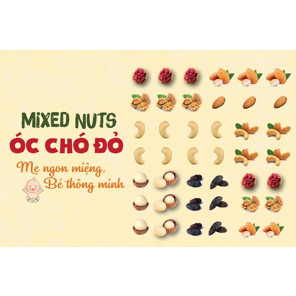 🔸 Trong hũ Mixed Nuts gồm có: - 20% nhân Macca Úc (100gr): Giàu Protein, vitamin B6, vitamin B1, Canxi, Sắt.. Có vị ngon đặc biệt - 10% nhân óc chó Hartley Mỹ vàng (50gr): lượng omega-3, omega-6 cao hơn tới 5 lần với cá hồi, giúp hình thành trí não thai nhi - 15% nhân óc chó đỏ California Mỹ (75gr): Là óc chó giàu dinh dưỡng nhất trong tự nhiên, gấp 2 lần so với óc chó thường. - 20% Nho khô Úc nguyên chùm (100gr): là dòng nho cao cấp, phơi trực tiếp dưới ánh nắng mặt trời, thịt dai, ngọt tự nhiên. Giúp giảm mệt mỏi, chóng mặt cho mẹ bầu, tăng độ ẩm cho da. - 20% Hạnh nhân Mỹ tách nướng dòn (100gr): Axit Folic với hàm lượng cao phòng tránh khuyết tật bẩm sinh cho bé,, điều hoà huyết áp, giảm căng thẳng và các cơn đau co thắt. - 15% Điều A+ Bình Phước (75gr): Hạm lượng canxi cao, giúp hình thành phát triển khung xương bé Hạn Sử Dụng: 6 tháng được ghi trên bao bì