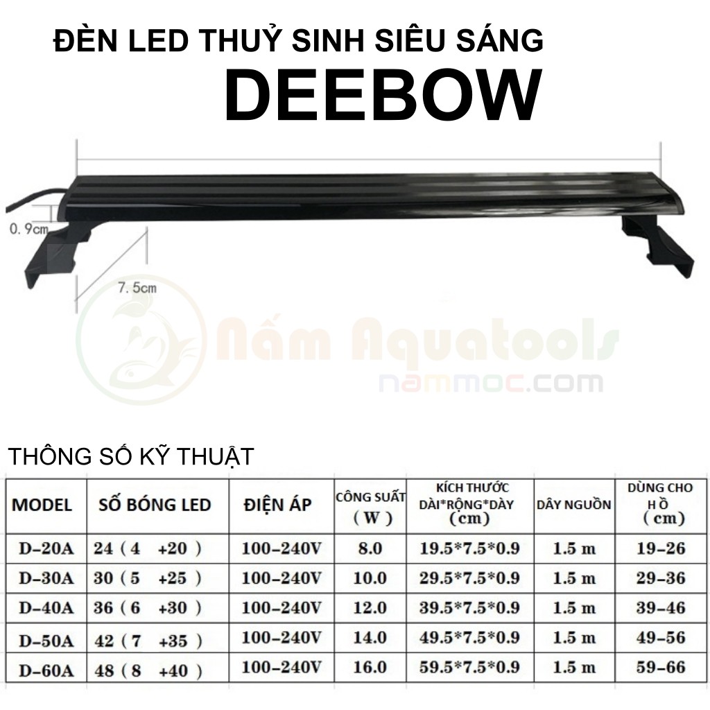 Đèn Led 𝐃𝐄𝐄𝐁𝐎𝐖 - Led siêu sáng giành cho bể thuỷ sinh Thương hiệu: DEEBOW ◙ Đặc điểm: - Đèn led DEEBOW với cường độ độ sáng cao, giúp cây thuỷ sinh quang hợp và phát triển tốt - Sử dụng chip Led 5730 siêu sáng và bền bỉ; - Đèn có bóng màu trắng và mix xanh làm tăng khà năng quang hợp cho cây, ánh sáng dịu, trung thực - Chân đèn có thể kéo dài và thu ngắn, - Máng nhựa ABS thiết kế sang trọng, có tấm Acrylic chắn nước cho dãy LED sáng ◙ Thông số kỹ thuật: ✔️Máng LED 𝐃𝐄𝐄𝐁𝐎𝐖 𝐃-𝟐𝟎𝐀 + Công suất: 8W / 24 bóng LED + Dùng cho hồ: 19-26cm ✔️ Máng LED 𝐃𝐄𝐄𝐁𝐎𝐖 𝐃-𝟑𝟎𝐀 + Công suất: 10W / 30 bóng LED + Dùng cho hồ: 29-36cm ✔️ Máng LED 𝐃𝐄𝐄𝐁𝐎𝐖 𝐃-𝟒𝟎𝐀 + Công suất: 12W / 36 bóng LED + Dùng cho hồ: 39-46cm ✔️ Máng LED 𝐃𝐄𝐄𝐁𝐎𝐖 𝐃-𝟓𝟎𝐀 + Công suất: 14W / 42 bóng LED + Dùng cho hồ: 49-56cm ✔️ Máng LED 𝐃𝐄𝐄𝐁𝐎𝐖 𝐃-𝟔𝟎𝐀 + Công suất: 16W / 48 bóng LED + Dùng cho hồ: 59-66cm