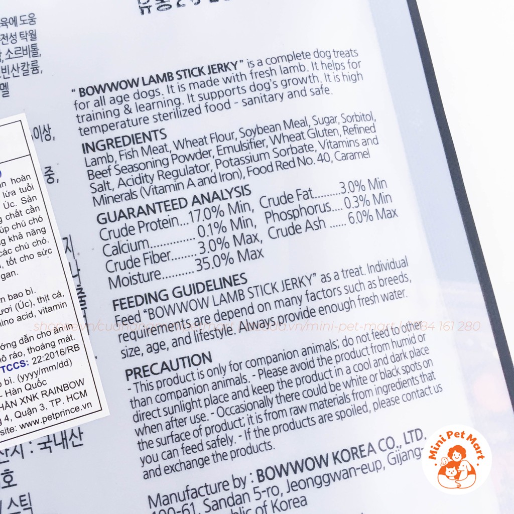 Thịt cừu que BOWWOW được chế biến từ thịt tươi sạch, chứa nhiều vitamin và giàu chất dinh dưỡng. Sản phẩm dạng mềm, có độ ngon miệng cao, phù hợp với nhiều giống cho ở mọi lứa tuổi. Có thể sử dụng làm thức ăn vặt, bánh thưởng hỗ trợ huấn luyện.