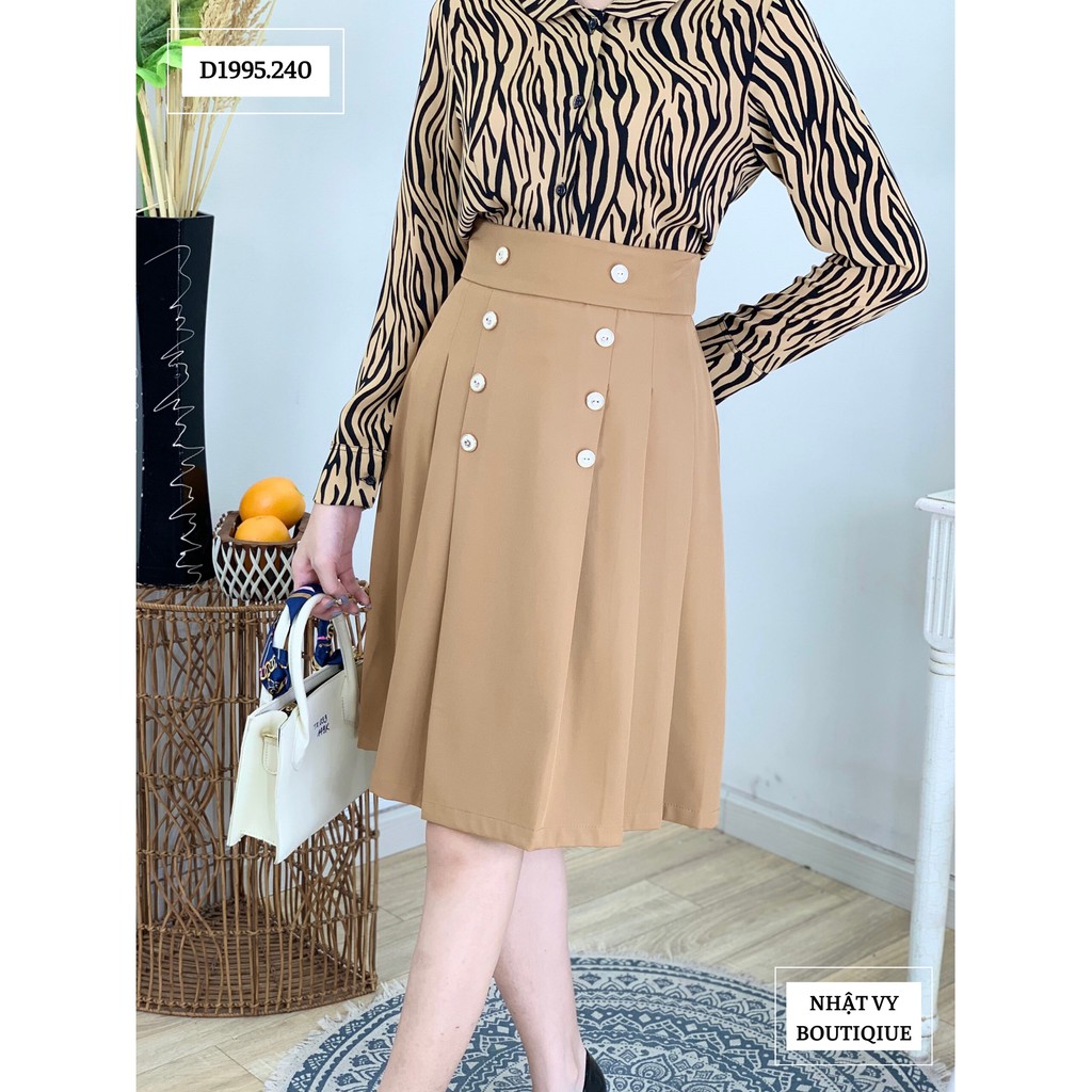 Thời Trang Nữ > Đồ truyền thống > Quần và chân váy || Chân Váy Nữ NHẬT VY Phối Cúc Xếp Ly Chất Kaki Thun Công Sở Dáng Xòe Màu Nâu, Đen - D1995