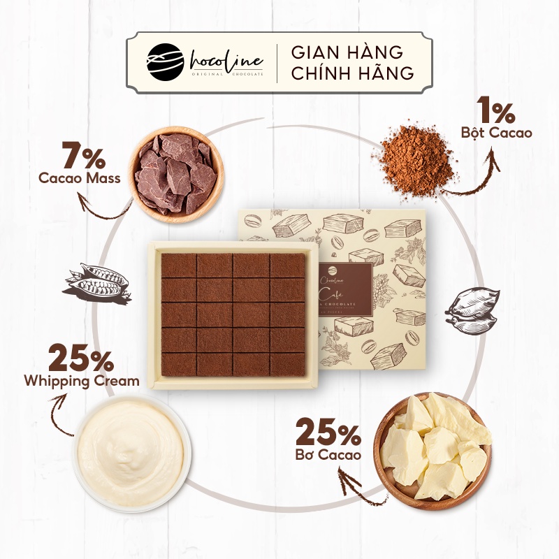 Cafe ( Chocolate vị Cafe): + Thành phần: Kem tươi 30%, Bơ cacao 25.5%,Cacao mass 7%, Sữa bột 15.5%, Đường19.5%, Bột cacao1%, Chiet Xuat Café 1%, Thành phần phụ 0.5% (gồm Sản phẩm có chứa sữa, lecithin(E322) và hương Vani tự nhiên). + Hương vị: Hương vị thơm đặc trưng của hạt cafe tây nguyên hòa cùng chút thơm béo, đắng hậu của 65% Cacao nguyên chất tạo nên sức hấp dẫn khó quên của Chocolate tươi vị Cafe