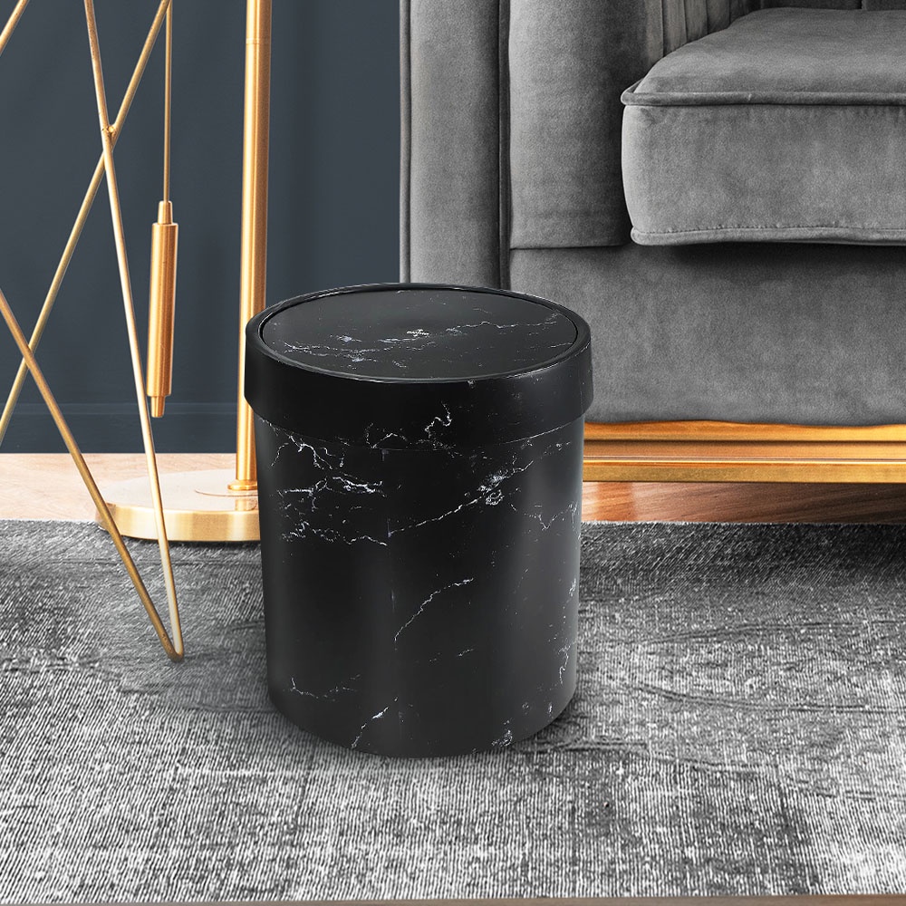 Thùng tròn có họa tiết đá cẩm thạch đen và dung tích 7 lít. Nắp xoay của thùng cho phép bạn bỏ rác dễ dàng. Thùng phù hợp để đựng rác thải khô và sử dụng trong nhà.