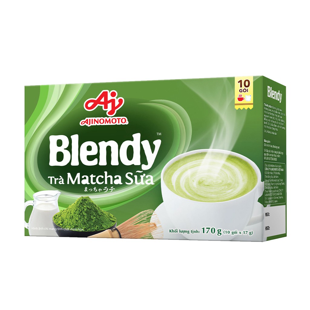 Các sản phẩm Thức uống hòa tan dạng bột BlendyTM luôn được chú trọng về thành phần nguyên liệu cốt lõi, từ việc chọn lọc nguyên liệu đầu vào tươi ngon cho đến khâu kiểm tra chất lượng nghiêm ngặt kỹ lưỡng trước khi sản xuất nhằm mang đến những sản phẩm ngon và chất lượng nhất. Các nguyên liệu đặc trưng cốt lõi cho từng sản phẩm sẽ được trộn thành hỗn hợp cùng với các thành phần khác như bột kem không sữa, muối, dầu cọ, đường v.v. để tạo chất kết dính, giúp tăng độ đồng đều cho sản phẩm. Hỗn hợp sau khi trộn sẽ được sàng lại để tạo thành bột BlendyTM và chuyển sang đóng gói thành phẩm. Thành phẩm cuối cùng được định lượng và đóng thành các gói dạng dây treo có trọng lượng nhất định hoặc được đóng thành hộp 10 gói, phù hợp để khách hàng lựa chọn theo nhu cầu mua dạng gói lẻ hay dạng hộp. Trà Sữa Matcha ""Blendy"" là sự kết hợp hài hòa giữa trà Matcha Nhật bản và sữa, được sản xuất theo công nghệ hiện đại Nhật Bản mang đến cho bạn những cảm nhận trọn vẹn nhất về hương thơm đặc trưng quyến rũ của trà Matcha Nhật Bản hòa quyện cùng vị sữa ngọt dịu. Hướng dẫn sử dụng: Uống nóng: Cho 1 gói Trà Matcha Sữa vào 70ml nước nóng, khuấy đều và thưởng thức Uống lạnh: Cho 1 gói Trà Matcha Sữa vào 40ml nước nóng, khuấy đều, thêm đá và thưởng thức.