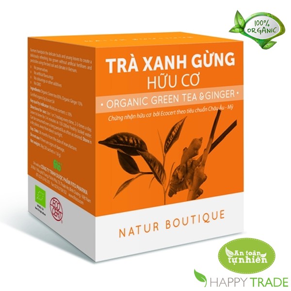 THÀNH PHẦN: Trà xanh hữu cơ 85%, Gừng hữu cơ 15%. (Được chứng nhận hữu cơ tiêu chuẩn EU do tổ chức Ecocert SA Cộng hòa Pháp cấp) CHỈ TIÊU CHẤT LƯỢNG CHỦ YẾU: Độ ẩm ≤ 10%
