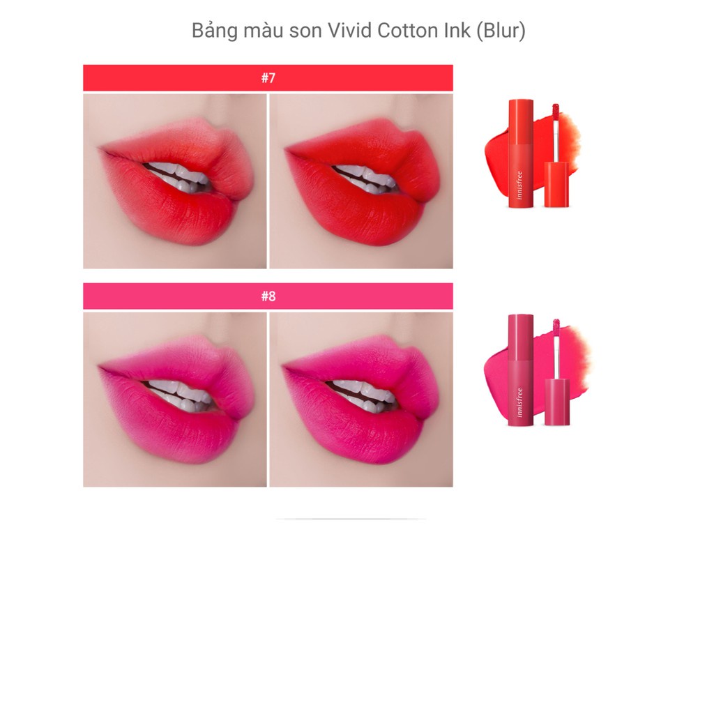 Son kem thế hệ mới innisfree Vivid Cotton Ink Blur lấy cảm hứng từ những cánh hoa tuplip giúp môi mịn như nhung, có hiệu ứng mờ nhẹ không gây bóng môi mà lại không quá lì, đem đến cảm giác ẩm mịn cho đôi môi