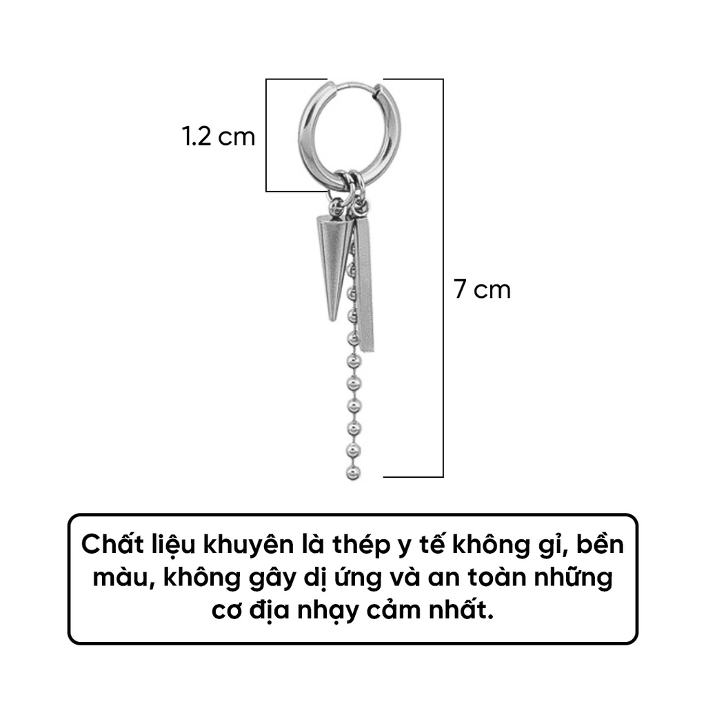 👉 THÔNG TIN SẢN PHẨM: - Khuyên tai nam nữ, bông tai nam nữ tròn màu bạc kết hợp với charm xích và hình chóp cá tính, size khuyên tròn là 12mm. - Chất liệu bông tai là hợp kim thép titan không gỉ, bền màu, không gây dị ứng và an toàn những cơ địa nhạy cảm nhất.