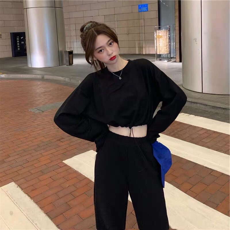 Giới thiệu [Mã FATHANG5 giảm 10K đơn 50K] Set thể thao áo croptop tay dài rút dây + quần jogger trơn dài ống bo unisex