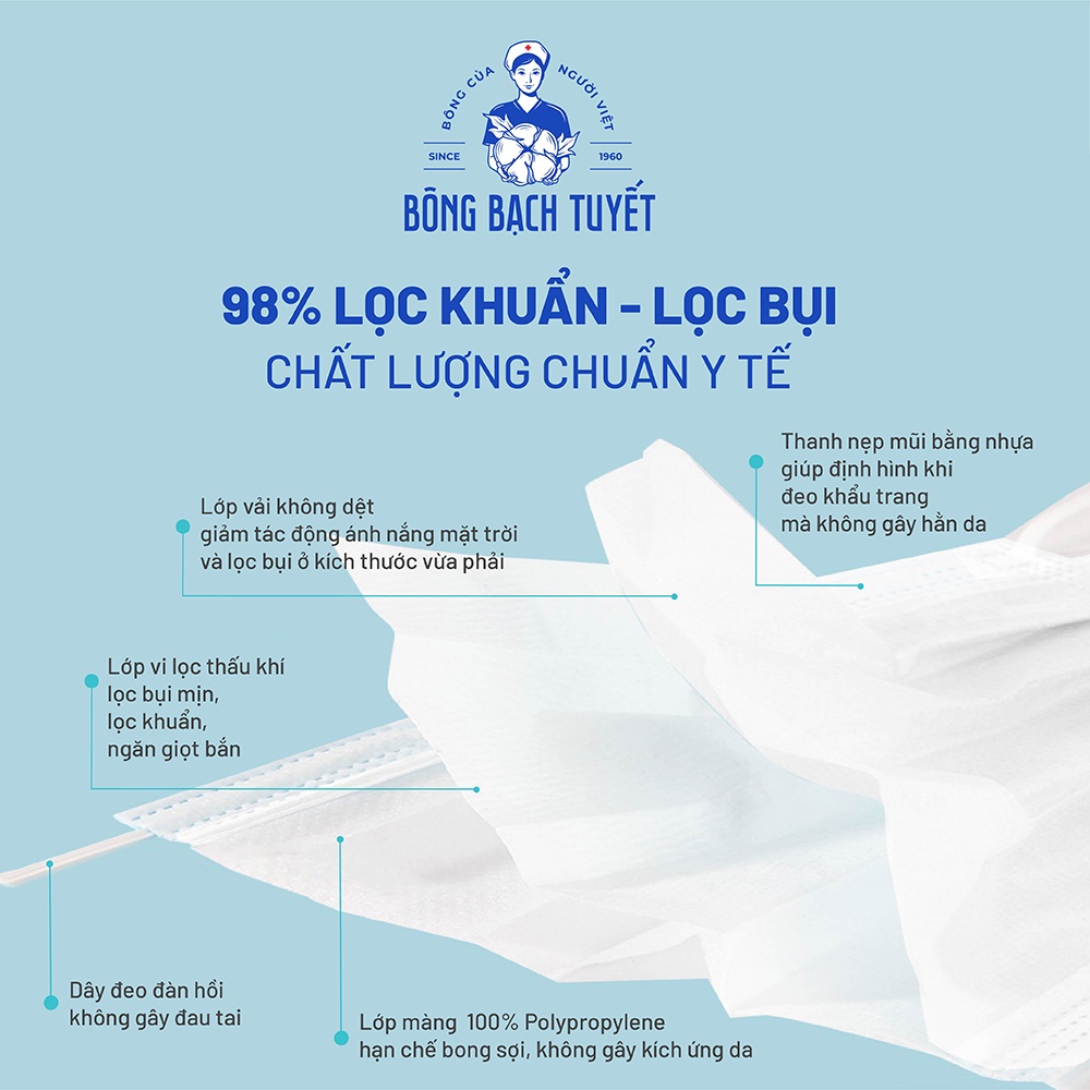 Thông tin chi tiết: Khẩu trang y tế 3 lớp Bông Bạch Tuyết với 2 lớp vải không dệt, không thấm nước; 1 lớp vải vi lọc thấu khí, không thấm nước; thanh nẹp bằng nhựa định hình. Thiết kế dây đeo đàn hồi cao mang đến sự thoải mái tuyệt đối khi dùng.