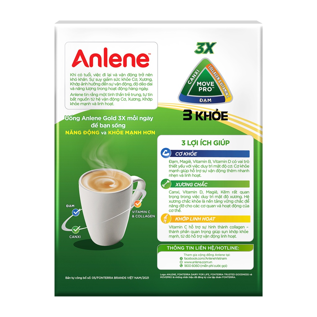 SỮA ANLENE GOLD VỊ CÀ-PHÊ: Sữa Anlene Gold vị Cà-phê MỚI với dạng gói nhỏ tiện dụng cung cấp hàm lượng cao Đạm, Canxi, Collagen, các loại Vitamin (B, C, D) & Khoáng chất (Magiê, Kẽm), giúp duy trì hệ vận động Cơ-Xương-Khớp khỏe mạnh, linh hoạt, cho bạn khởi đầu ngày mới năng động! 03 LỢI ÍCH VƯỢT TRỘI TRONG MỖI LY SỮA ANLENE GOLD: CƠ KHỎE: Sữa Anlene Gold chứa Đạm, Magiê, Vitamin B, Vitamin D có vai trò thiết yếu với việc duy trì mật độ cơ. Cơ khỏe mạnh giúp hỗ trợ sự vận động thêm nhanh nhẹn & linh hoạt. XƯƠNG CHẮC: Canxi, Vitamin D, Magiê, Kẽm rất quan trọng trong việc duy trì mật độ xương. Hệ xương chắc khỏe là nền tảng vững chắc để nâng đỡ cho các cơ quan và hoạt động của cơ thể. KHỚP LINH HOẠT: Vitamin C hỗ trợ sự hình thành collagen – thành phần quan trọng giúp sụn khớp khỏe mạnh, từ đó hỗ trợ vận động linh hoạt. Khởi đầu ngày mới khỏe mạnh & tỉnh táo với Anlene Gold vị cà-phê mỗi buổi sáng! Sản phẩm có đa dạng hương vị để bạn lựa chọn và thay đổi tùy theo sở thích: Sữa Anlene Gold Hương Vani Sữa Anlene Gold Vị Sô-cô-la Sữa Anlene Gold Vị Cà-phê HƯỚNG DẪN SỬ DỤNG: Hòa 01 gói Anlene Cà-phê vào nước ấm, tùy chỉnh lượng nước theo sở thích sữa cà phê đậm nhạt của bạn. Uống nóng: + Vị dịu nhẹ: 01 gói + 200 ml nước + Vị hài hòa: 01 gói + 180 ml nước + Vị đậm đà: 01 gói + 160 ml nước Uống đá: + Đậm vị sảng khoái: 01 gói + 80 ml nước + đá viên ***Thông tin cảnh báo: Không dùng sản phẩm khi đã hết hạn sử dụng. Sản phẩm có chứa sữa, collagen chiết xuất từ cá và sản phẩm từ đậu nành Bao bì thay đổi theo từng đợt nhập hàng Hạn sử dụng: 18 tháng Sản phẩm này không phải là thuốc và không có tác dụng thay thế thuốc chữa bệnh Xuất xứ : Malay