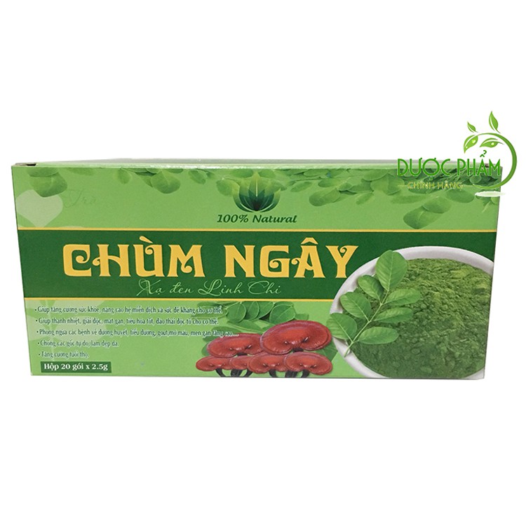 2. Thành phần - Chùm ngây 60% - Xạ đen 20% - Cỏ ngọt 15% - Linh chi 5% - Phụ liệu vừa đủ 3.Công dụng - Trà Chùm Ngây linh chi giúp tăng cường sức khỏe, nâng cao hệ miễn dịch và sức đề kháng cho cơ thể - Giúp thanh nhiệt, giải độc, mát gan, hạ men gan, hỗ trợ tích cực trong việc hạ men gan, gan nhiễm mỡ, viêm gan, giúp gan đào thải độc tố trong cơ thể - Phòng ngừa hiệu quả các bệnh về đường huyết, tiểu đường, gout, mỡ máu, … - Bồi bổ sức khỏe, phòng ngừa ung thư, chống các gốc tự do, làm đẹp da, mịn da, tăng cường tuổi thọ 4.Hướng dẫn sử dụng - Ngâm túi tra chùm ngây xạ đen linh chi có trong nước sôi 1000C, sử dụng sau 3-5 phút. Có thể thêm đá nếu thích. Mỗi ngày nên dùng 3-5 túi lọc 2g hoặc 2-3 túi lọc 5g - Để thu được đầy đủ hoạt chất tốt nên cho vào đun sôi hoặc pha trong bình thủy. 5. ĐỐi tượng sử dụng -Người bị mỡ máu cao, suy nhược cơ thể -Người men gan cao do thường xuyên uống rượu bia, nóng gan, viêm gan, gan nhiễm mỡ được khuyên dùng thường xuyên thay trà uống hằng ngày giúp thanh lọc cơ thể - Người bị mụn trứng cá, người muốn tăng sức đề kháng 6.Quy cách đóng gói: Hộp 20 gói x 2,5g 7.Bảo quản: Sản phẩm này không sử dụng chất bảo quản, nên để nơi khô ráo, dưới 300C, tránh ánh sáng mặt trời chiếu trực tiếp 8.SĐK: 42/2017/YTHB-XNCB 9.Tiêu chuẩn: TCCS Hạn sử dụng: 36 tháng kể từ ngày sx #trachumngaylinhchixaden #trachumgngayxaden #trachumngaylinhchi #trathaoduocchumgngay #trachumgngaythaoduoc #trathanhnhiet #trathanhloc #trachumngayxadenlinhchi #tratuiloc #tratuilocchumgngay #trachumngaytuiloc #chumngaytra #chumngay #thaoduocchumngay #trauong #trauongthaoduoc