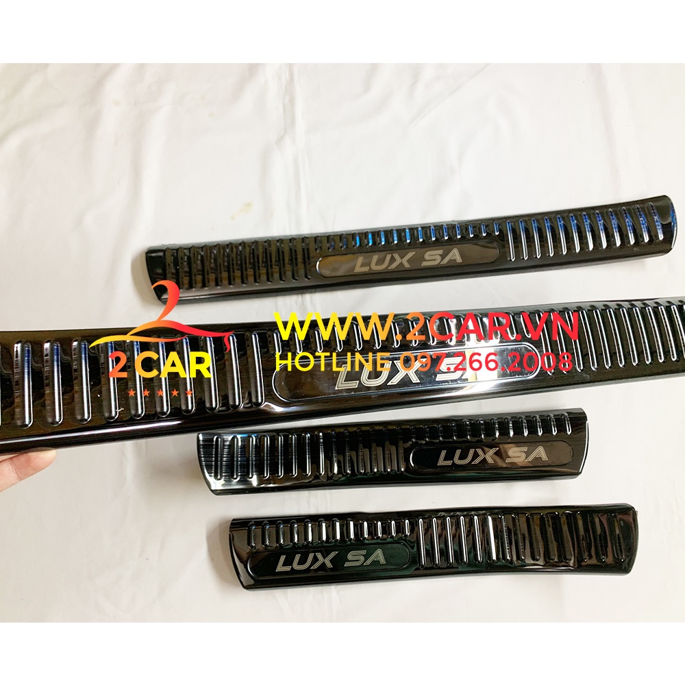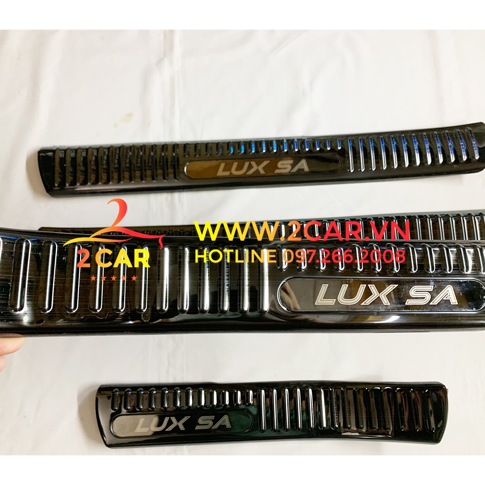 Ốp bậc cửa, nẹp bước chân trong xe Vinfast LUX SA, chất liệu TITAN cao cấp Chất liệu thép mạ TITAN không rỉ, được thiết kế tinh tế và sản xuất vừa vặn phom của bước chân lên xuống của xe. Điều đặc biệt là bộ Ốp bậc này có sẵn loại băng keo chuyên dụng giúp người dùng có thể tự lắp đặt tại nhà mà không cần tới sự trợ giúp của kĩ thuật viên cũng như không cần phải mang đến các Gara lắp đặt. Quý khách hàng có thể hoàn toàn yên tâm mua hàng mà không cần lo lắng đến vấn đề lắp đặt. Sản phẩm giúp bao bọc, bảo vệ cho bộ phận bậc cửa trong của xe được thêm phần chắc chắn hơn. Tránh sự trầy xước hay bong tróc sơn do tác động trực tiếp của đế giây, đế dép hay của những tác nhân khác gây ra. Mang đến cho bậc cửa trong của xe một vẻ đẹp như mới, hiện đại và cuốn hút. Đồng thời tạo nên sự mạnh mẽ, chắc chắn cho xế yêu. Màu sắc : Sản phẩm có màu đen sang trọng cùng với biểu tượng logo vô cùng nổi bật. Bộ sản phẩm bao gồm 4 chi tiết Cam kết trả hàng hoàn tiền nếu như khách hàng thấy sản phẩm mình đặt không đúng chủng loại hoặc mẫu mã sai lệch. Giao hàng toàn quốc( Thanh toán - nhận hàng - kiểm tra hàng).