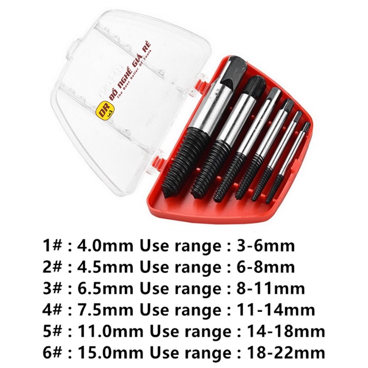 *Hiện shop có các phân loại sau : _ Bộ 5 món: Sử dụng được cho size 3 - 18MM _ Bộ 6 món: Sử dụng được cho size 3 - 22MM _ Bộ 8 món: Sử dụng được cho size 3 - 25MM + Tháo được ống nước size 1/2, 3/4 inch _ Bộ phụ kiện giúp bạn mở những chiếc bu lông ốc vít bị gãy hay bị toét đầu mũ không thể tháo mở bằng các dụng cụ thông thường. _ Được sản xuất bằng thép hợp kim Cr-V siêu cứng, chống gỉ giúp đầu vít dễ dàng khoan sâu vào những chiếc bu lông bị gãy _ Quy cách các đầu vít: #1: 4mm (phạm vi sử dụng từ 3-6mm) #2: 4.5mm (phạm vi sử dụng từ 6-8mm) #3: 6.5mm (phạm vi sử dụng từ 8-11mm) #4: 7.5mm (phạm vi sử dụng từ 11-14mm) #5: 11mm (phạm vi sử dụng từ 14-18mm) #6: 15mm (phạm vi sử dụng từ 18-22mm) #7: Tháo ống nước size 1/2 inch (25-35mm) #8: Tháo ống nước size 3/4 inch (35-45mm)