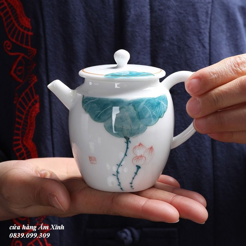 Sản phẩm sứ Cảnh Đức được làm hoàn toàn thủ công bởi bàn tay của những người nghệ nhân yêu nghề, luôn đem trọn tâm huyết của mình thổi hồn vào từng sản phẩm. Từng đường nét hoa văn trên ấm cũng được vẽ bằng tay, do đó các sản phẩm làm ra sẽ có 1 chút khác biệt nho nhỏ. Cấu tạo: Trong lòng ấm: tráng men mỏng, đảm bảo độ thẩm thấu cao, lưu giữ hương thơm của trà. Quai ấm: phần tay cầm chuẩn xác, giữ được thăng bằng. Nắp ấm: Vừa khít miệng ấm. Trên nắp có một lỗ nhỏ được khoét giúp cho không khí có thể vào trong ấm, cân bằng áp suất không khí trong và ngoài ấm, tránh tình trạng vòi ấm bị nhỏ giọt và dễ dàng rót nước trà ra. Hướng dẫn sử dụng: Trước khi pha trà, tráng ấm bằng nước nóng để đánh thức hương thơm của trà. Hướng dẫn bảo quản: Rửa lại bằng nước sạch sau khi sử dụng (Lưu ý không rửa bằng xà phòng, vì chất liệu gốm sứ có tính thẩm thấu cao).