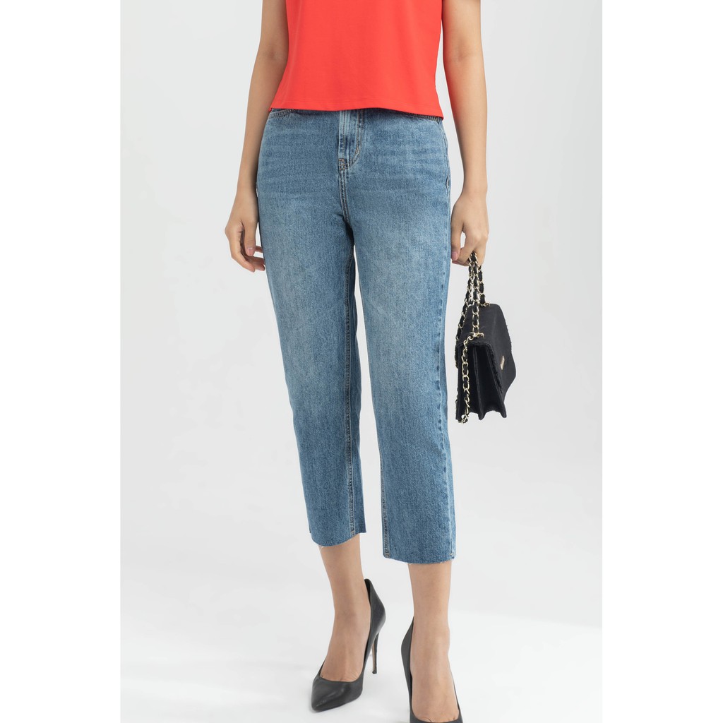 Quần jeans cạp cao có đỉa. Ống dài, gấu xổ chỉ. Có túi phía trước và 2 túi vuông phía sau. Cài khóa kéo và khuy kim loại.