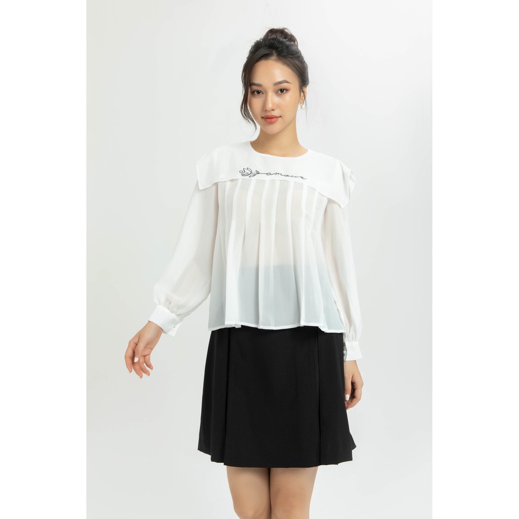 Áo sơ mi cổ tròn, tay dài bo gấu. Vai áo được ráp vải, thêu chữ và hình hoa hồng bằng chỉ nổi khác màu. Phần thân áo xếp ly đều tạo cảm giác bồng bềnh.