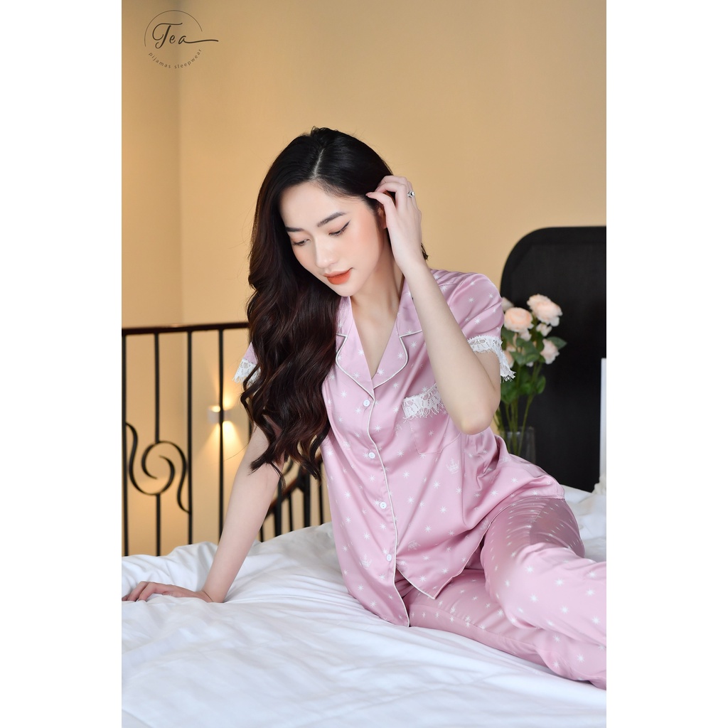 Giới thiệu Bộ mặc nhà Pyjama chất lụa Tea Store áo cộc quần dài họa tiết bling đáp ren sang trọng