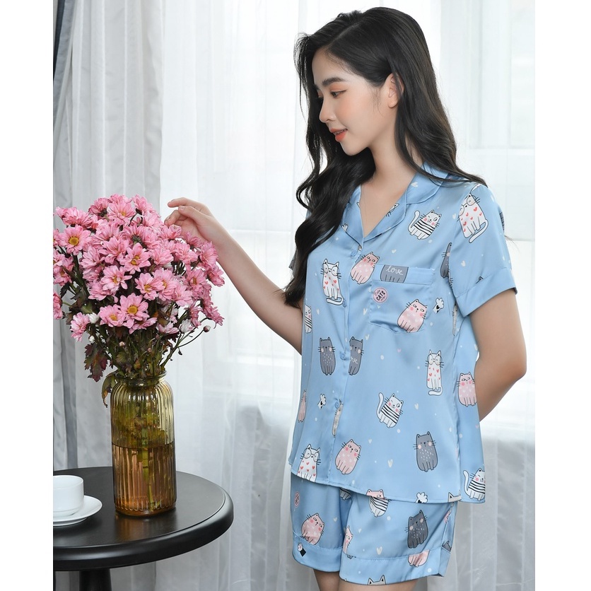 Giới thiệu Bộ mặc nhà pyjama lụa cộc Tea Store họa tiết mèo hàng thiết kế