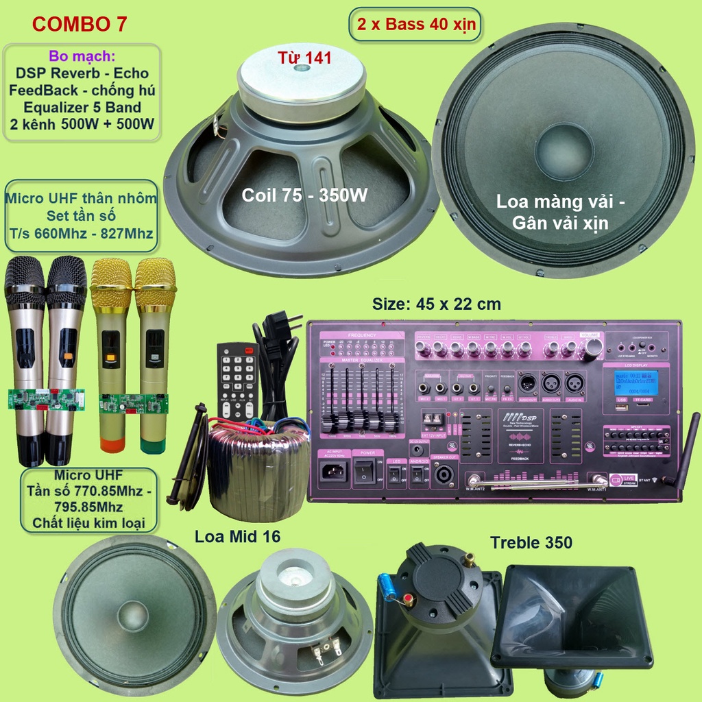 Combo 1: 2 Bộ Mic UHF chống hú Pin 18650 Combo 2: 1 Bộ Mic UHF chống hú Pin 18650 + 1 Bộ Mic UHF SET tần số Combo 3: 1 Bộ Mic UHF chống hú Pin 18650 + 1 Bộ Mic UHF chống hú Combo 4: 1 Bộ Mic UHF chống hú Pin 18650 + 1 Bộ Mic UHF vàng Combo 5: 2 Bộ Mic UHF SET tần số Combo 6: 1 Bộ Mic UHF SET tần số + 1 Bộ Mic UHF chống hú Combo 7: 1 Bộ Mic UHF set tần số + 1 Bộ Mic UHF vàng Combo 8: 1 Bộ Mic UHF chống hú + 1 Bộ Mic VHF Combo 9: 1 Bộ Mic UHF + 1 Bộ Mic VHF vàng Đặc điểm nổi bật: Sử dụng chip DSP lập trình chuyên dụng xử lý riêng độc lập cho phần độ vang Reverb + Echo) kết hợp chống hú hiệu quả cao Có chức năng phát trực tiếp LIVESTREAM Tích hợp Equalizer 5 Band âm thanh chỉnh âm thanh cực nét các dải tần. Đẩy Bass xuống cực Sâu như âm Sub Mạch chạy FET IRFB4227 cho công suất lớn nhất (LOA KÉO). Mạch 2 kênh độc lập rất thích hợp cho loa đôi. Công suất thực 500W + 500W. Dùng cho loa kéo 6 tấc đôi hoặc 5 – 4 tấc đôi 1 công tắc Led và ngõ ra 12V bên trong mạch cho phép lắp 2-4 led nháy theo nhạc 1 công tắc Android và 1 ngõ ra Output 12V dòng lớn cho phép lắp thêm màn hình cảm ứng hoặc cấp nguồn cho 1 thùng loa khác 2 Hàng Led nhấp nháy theo tần số cho phép giám sát được đáp ứng âm thanh ngõ ra 1 ngõ ra loa SPEAKER OUT – kết nối với thùng loa thứ 2 Chi tiết sản phẩm: Kích thước tấm sắt: 22 x 45cm. Chiều sâu mạch 13.5cm Mạch sử dụng 10 FET, FET công suất IRFB4227 10 Volume chỉnh: Reverb – Delay – Echo – M.Bass – M. Treble – M.Vol – GT.Vol Treble – Bass – Volume.Vì sử dụng chip DSP lập trình độc lập chuyên xử âm Reverb nên cho tiếng ca Reverb Sâu và mượt Và Equalizer 5 band: 100Hz500Hz1Khz5Khz10Khz. 2 cần chỉnh Bass, 1 cần chỉnh Trung và 2 cần chỉnh. Đẩy âm thanh cực kỳ sắt nét, Bass kéo Sâu như tiếng Sub Khối LIVESTREAM có 2 ngõ vào cắm Live điện thoại và 1 cổng tai nghe. Nút nhấn để chọn chế độ LIVESTREAM hoặc bình thường Có 1 nhấn FB EX chức năng chống hú. Nhấn vào có tác dụng chống hú, nhả ra bình thường. Nếu ca đứng trước loa thì nhấn chống hú. Chíp DSP lập trình xử lý chống hú hiệu quả cao Và 1 Nút MIC.PRI có chức năng cho thuyết trình hoặc MC chẳng hạn Mạch là sản phẩm điện tử nên sẽ có mối hàn chì bị đen và keo trên dính bề mặt Lắp loa đầy đủ trước khi cấp nguồn cho mạch Bass 4 tấc: Màng vảiviền vải Công suất 200W300W trở kháng 4 ôm : thông số chuẩn, loa chuyên nghiệp cho loa kéo cho âm thanh hay, Bass mạnh, độ vang xa. Từ 141mm Khung loa: chất liệu thép cứng cáp, giúp cho loa không bị cong vênh Loa Trung 6.5 inch: Công suất 35W trở kháng 6 ôm: âm thanh sắt nét, lời ca rõ ràng Từ 70mm. Khoảng cách bắt vít: 15cm, khoảng cách viền loa: 16cm Củ loa treble 350 cho loa kéo Karaoke Loa treble 350 Ứng dụng cho loa kéo, loa gia đình thích hợp cho bass 3tấc 4tấc 5 tấc tiếng treble mịn sáng tiếng. Trở kháng loa: 6omh Công suất: 69-120W (max) Tần số: 1khz20khz Độ nhạy: 103dB #loakeoreverb #machloakeoreverb #reverb #machloakeo4tacdoi #machloakeo #machloakeokeo #machloakeocongsuatlon #machloakeokaraoke #machloakeogiare #machloakeodoi