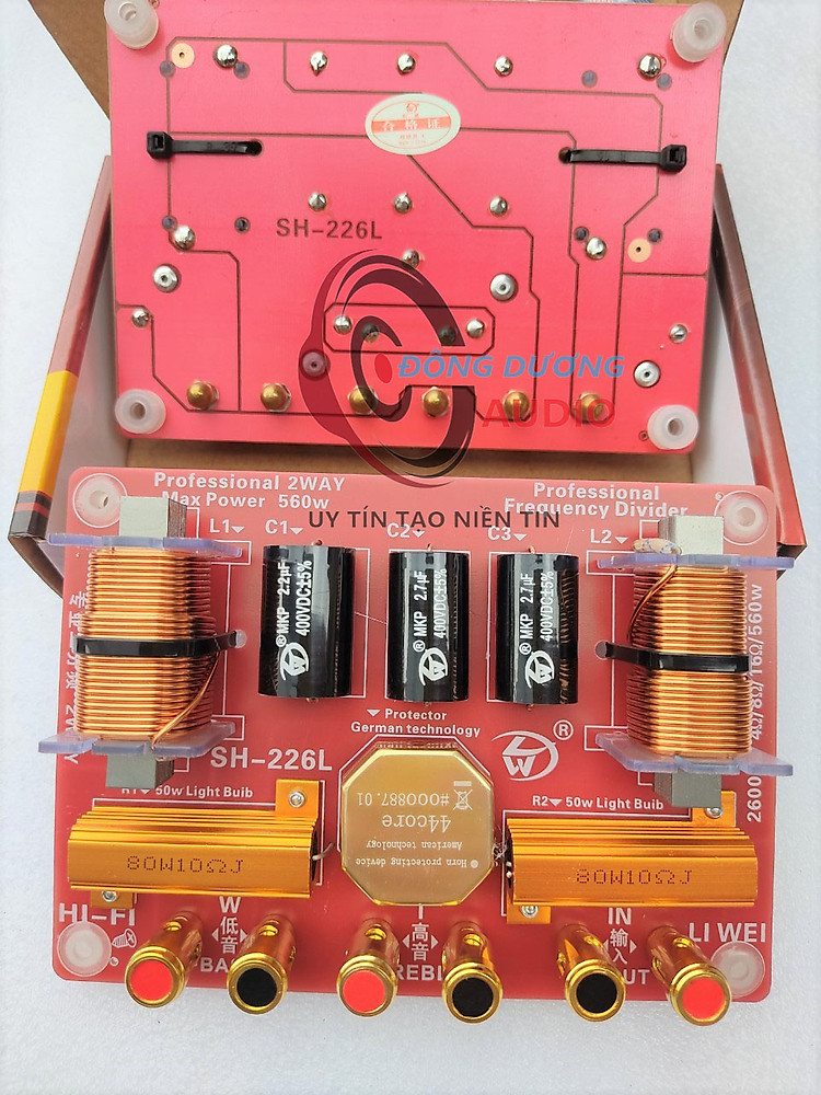 Thông tin phân tần SH-226L - Kích thước : 16 x 11.5cm - Trọng lượng : 500g/mạch - Cuộn cảm bass : lõi đồng + 2 tụ lọc bass 2.7mf = 5.4mf. - Lọc trép : tụ 2.2mf + cuộn cảm lõi đồng + bộ bảo vệ treble 450.