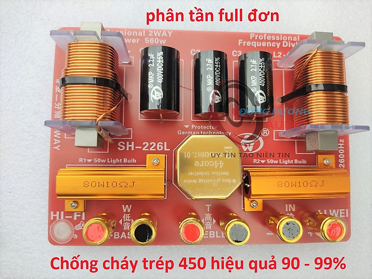 - Với các mạch phân tần thông thường , treble chỉ có cuộn cảm + trở + tụ và cầu chì chống cháy, có tác dụng bảo vệ trép, tuy nhiên không quá triệt để, nếu cháy cầu chì thì sẽ phải thay cái mới, tương đối bất tiện. - Phân tần SH - 226L là một trong những mẫu phân tần mới của LI WEI, phân tần được tích hợp công nghẹ tiên tiến. với việc gắn mạch bảo vệ treble 450. sẵn trong phân tần. hiệu quả bảo vệ treble lên đến 90 - 99%.