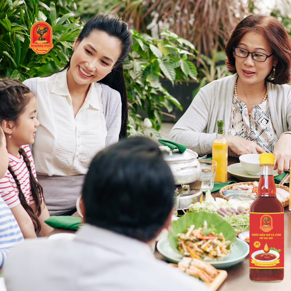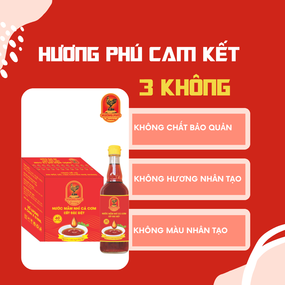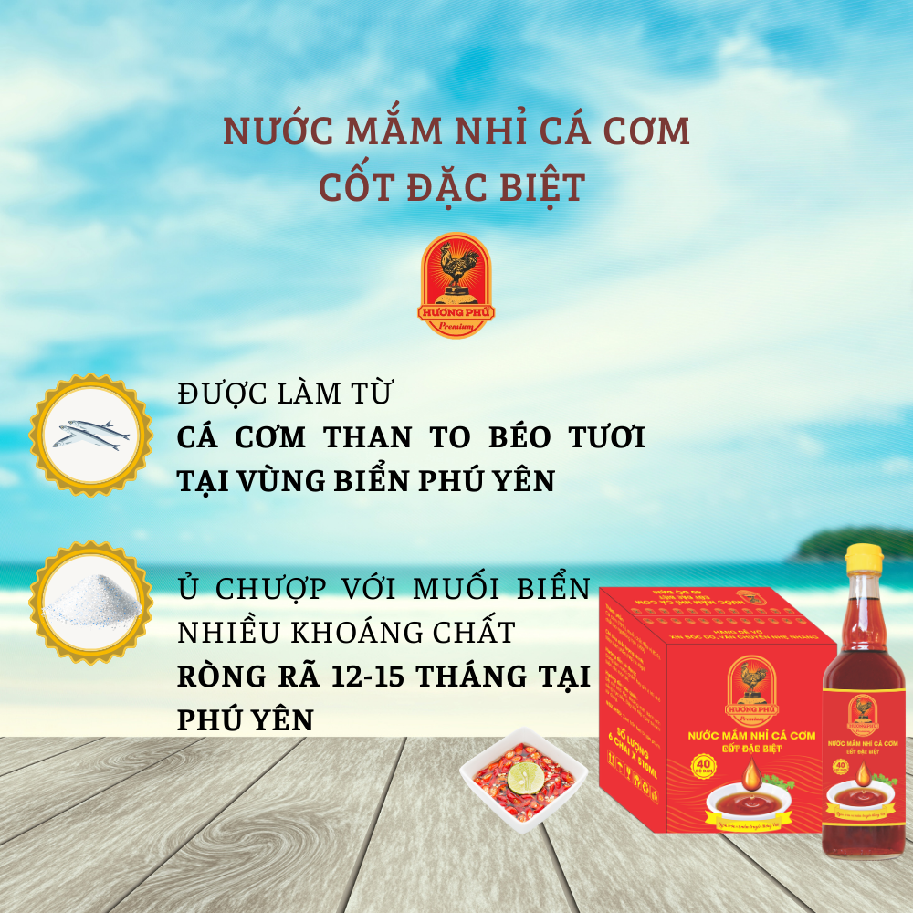 Với 100% cá cơm tươi, béo ú được chọn lựa kỹ được kết hợp với muối tinh khuyết được ủ bằng phương pháp truyền thống trong thùng gỗ được lên men tự nhiên, sau 18 đến 24 tháng những dòng nước cốt nguyên chất, không pha được rút, nhỉ ra từng giọt mắm màu cánh gián đẹp mắt, đậm đà, hậu vị ngọt dịu, được đóng chai tạo nên Nước mắm nhỉ cá cơm cốt đặc biệt HƯƠNG PHÚ 40 độ đạm.