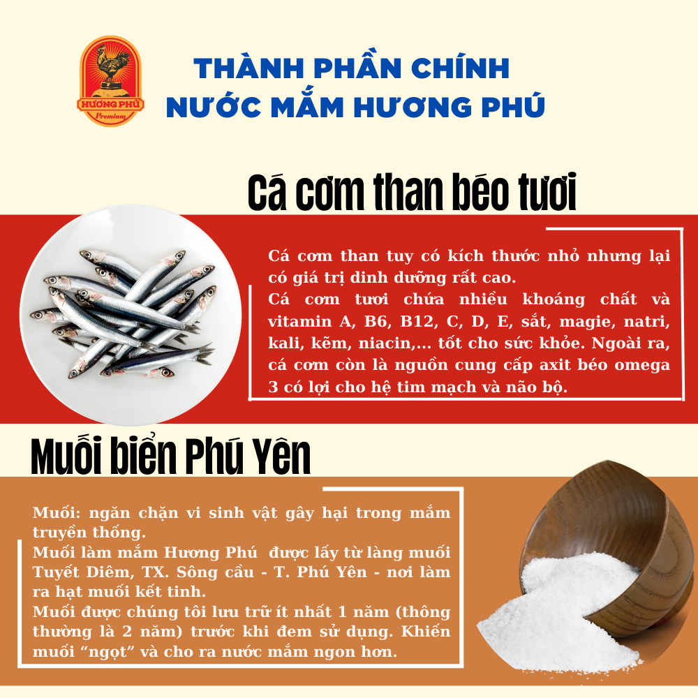 Với 100% cá cơm tươi, béo ú được chọn lựa kỹ được kết hợp với muối tinh khuyết được ủ bằng phương pháp truyền thống trong thùng gỗ được lên men tự nhiên, sau 18 đến 24 tháng những dòng nước cốt nguyên chất, không pha được rút, nhỉ ra từng giọt mắm màu cánh gián đẹp mắt, đậm đà, hậu vị được đóng chai tạo nên Nước mắm nhỉ cá cơm cốt đặc biệt HƯƠNG PHÚ 40 độ đạm.
